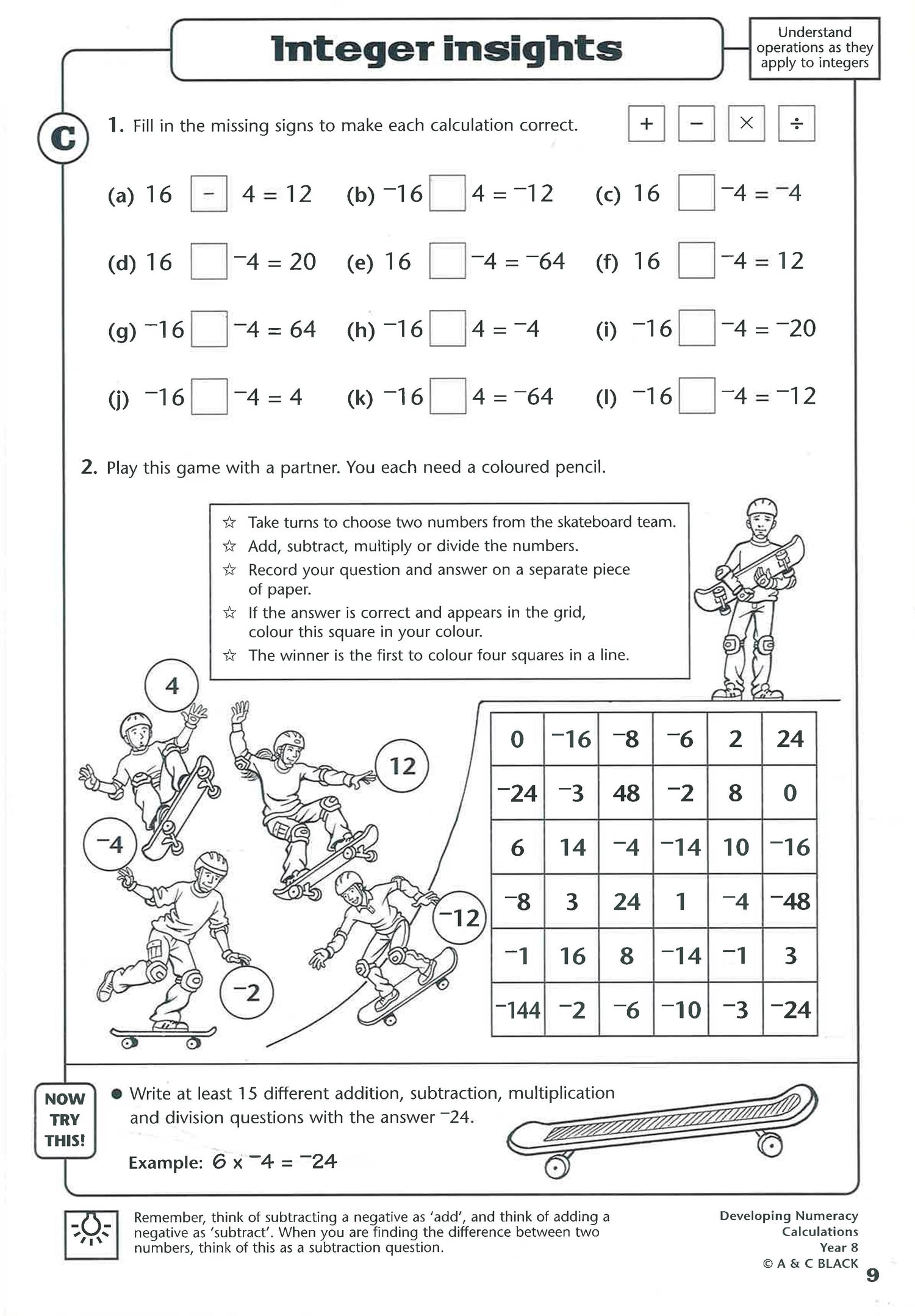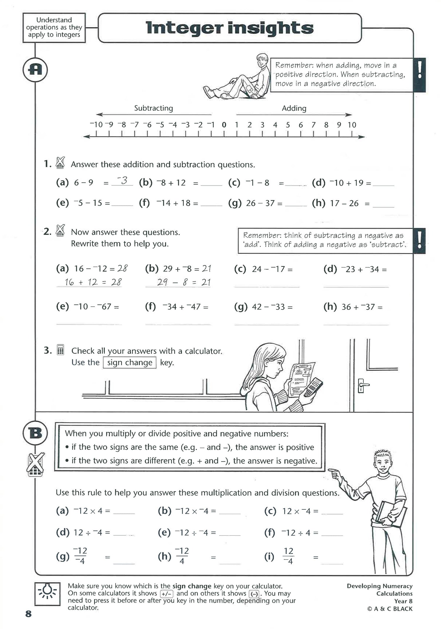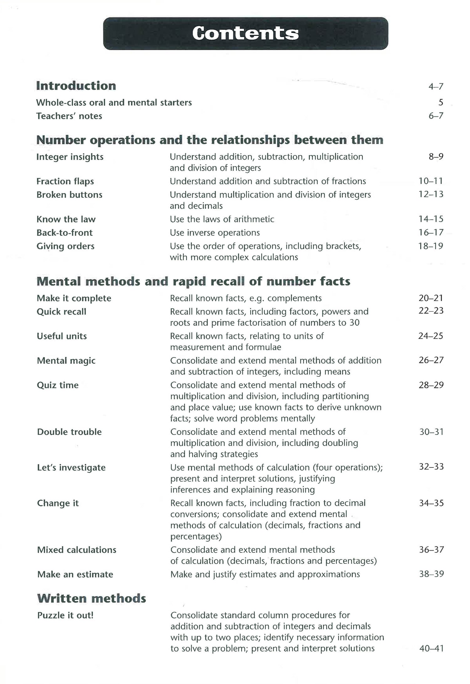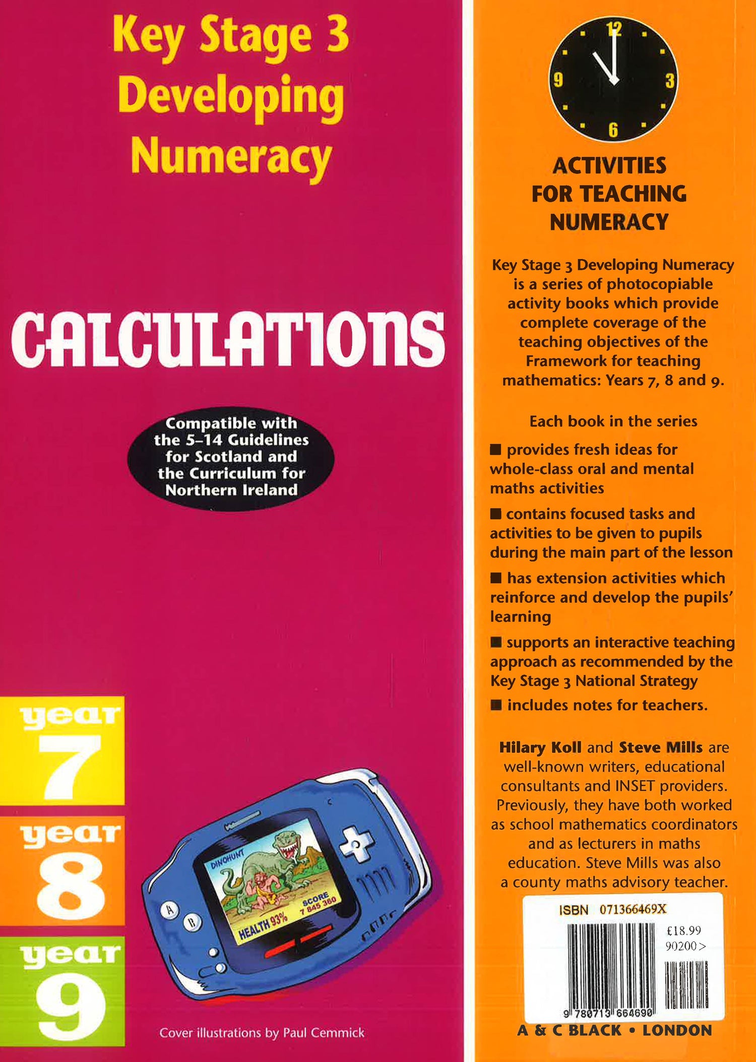 A photocopiable maths activity book for Key Stage 3 students in Year 8. It seeks to cover all the key objectives of the Calculations" strand of the National Numeracy Strategy framework. There are over 50 pages of photocopiable activities, and minimal teacher preparation is required. There are ideas for whole-class oral and mental maths "starter" activities (as recommended by the framework). Each activity is divided into three progressive steps for easy differentiation, and extension learning activities are provided to reinforce and develop the pupils' learning. There are notes for teachers. The text is part of a series in which there is one book for each year group at Key Stage 3, from Year 7 to Year 9."