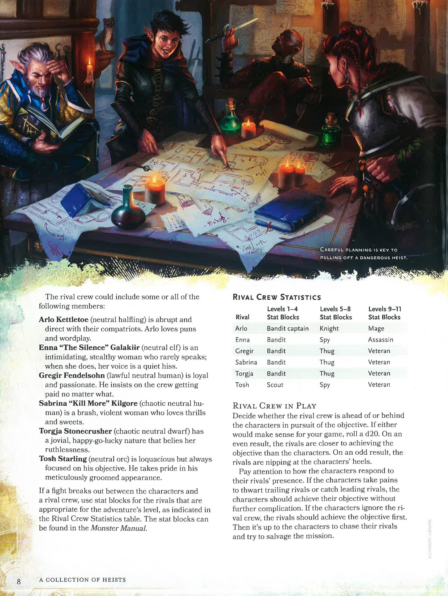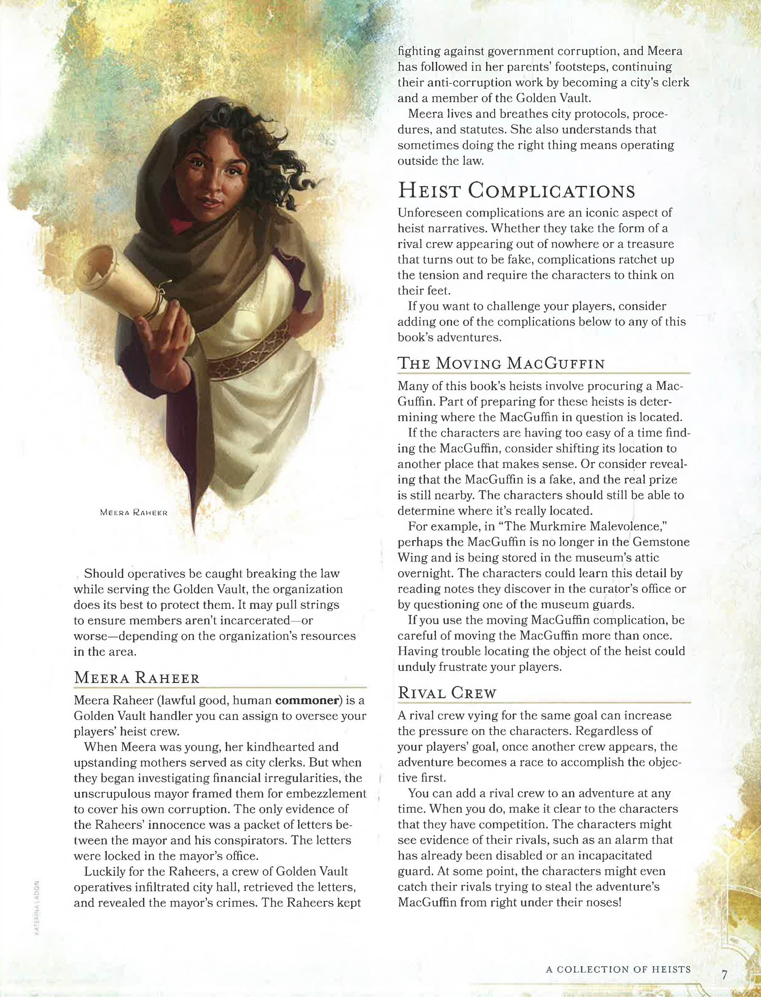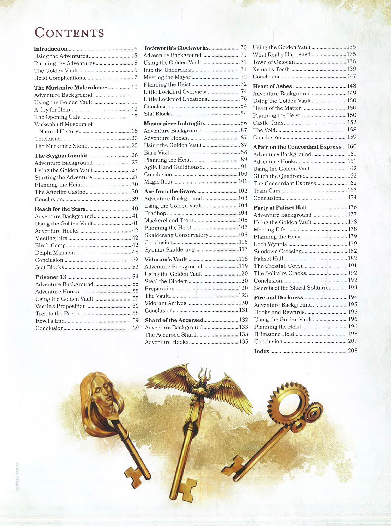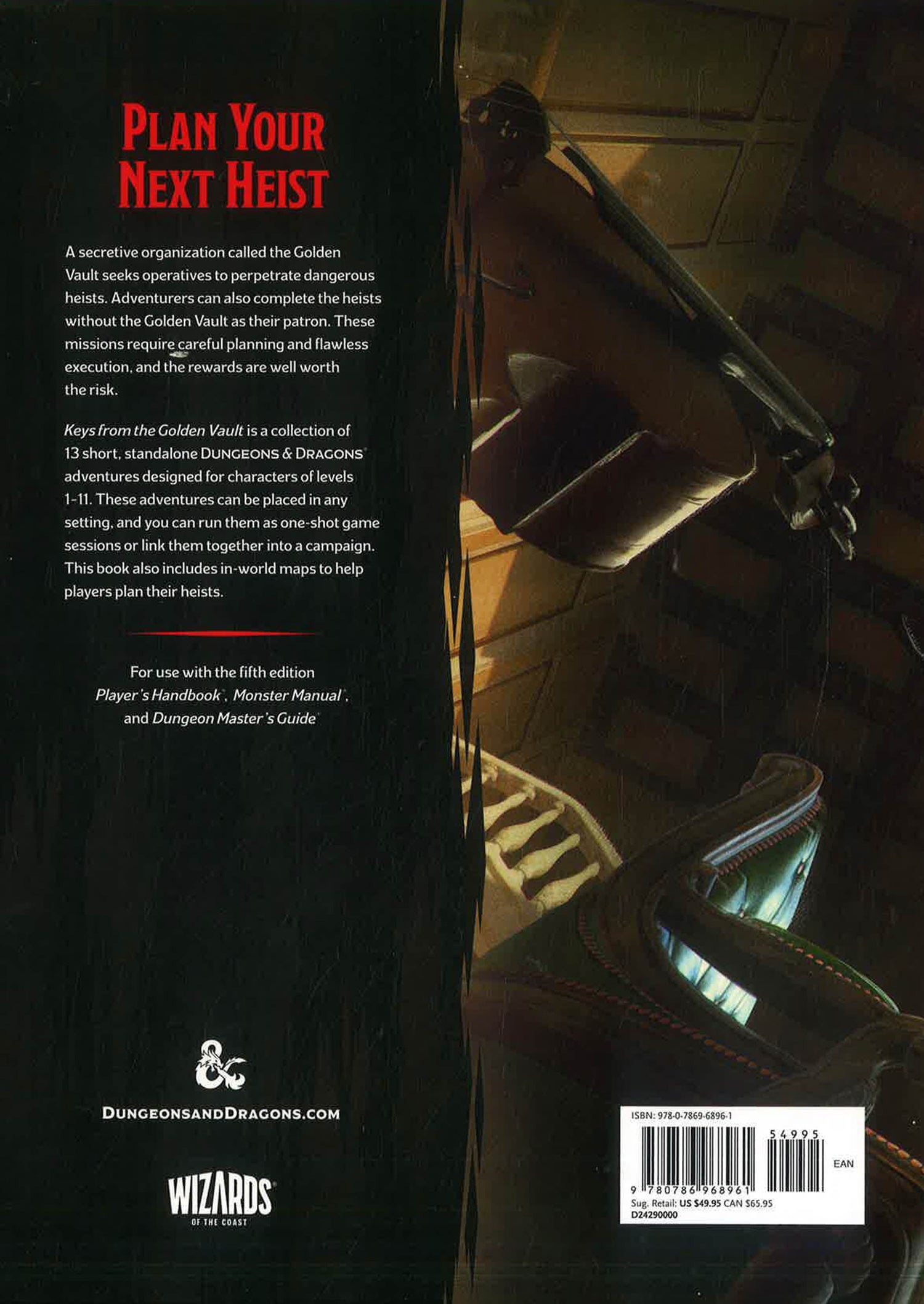 An anthology of 13 heist-themed adventures for the world’s greatest roleplaying game. Some jobs require more than simply wielding a sword or slinging a spell. Whether it’s procuring a well-guarded item or obtaining crucial information from an imprisoned contact, these tasks require careful planning and flawless execution. The secretive organization called the Golden Vault specializes in hiring crews for such jobs, and for the most daunting assignments—pursuing fabulous treasures and stopping dire threats—that crew is your characters. Keys from the Golden Vault™ is a collection of 13 short, standalone Dungeons & Dragons adventures designed for characters levels 1–11. These adventures can be placed in any setting and you can run them as one-shot games or link them together into a campaign. This book also includes in-world maps to help players plan their heists, plus advice for running nontraditional games with high risks and huge rewards.