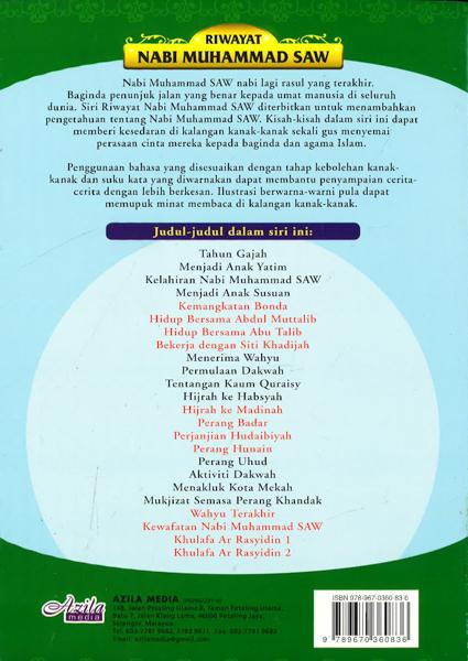 Nabi Muhammad SAW nabi lagi rasul yang terakhir. Baginda penunjuk jalan yang benar kepada umat manusia di seluruh dunia. Siri Riwayat Nabi Muhammad SAW diterbitkan untuk menambahkan pengetahuan tentang Nabi Muhammad SAW. Kisah-kisah dalam siri ini dapat memberi kesedaran di kalangan kanak-kanak sekali gus menyemai perasaan cinta mereka kepada baginda dan agama Islam.
