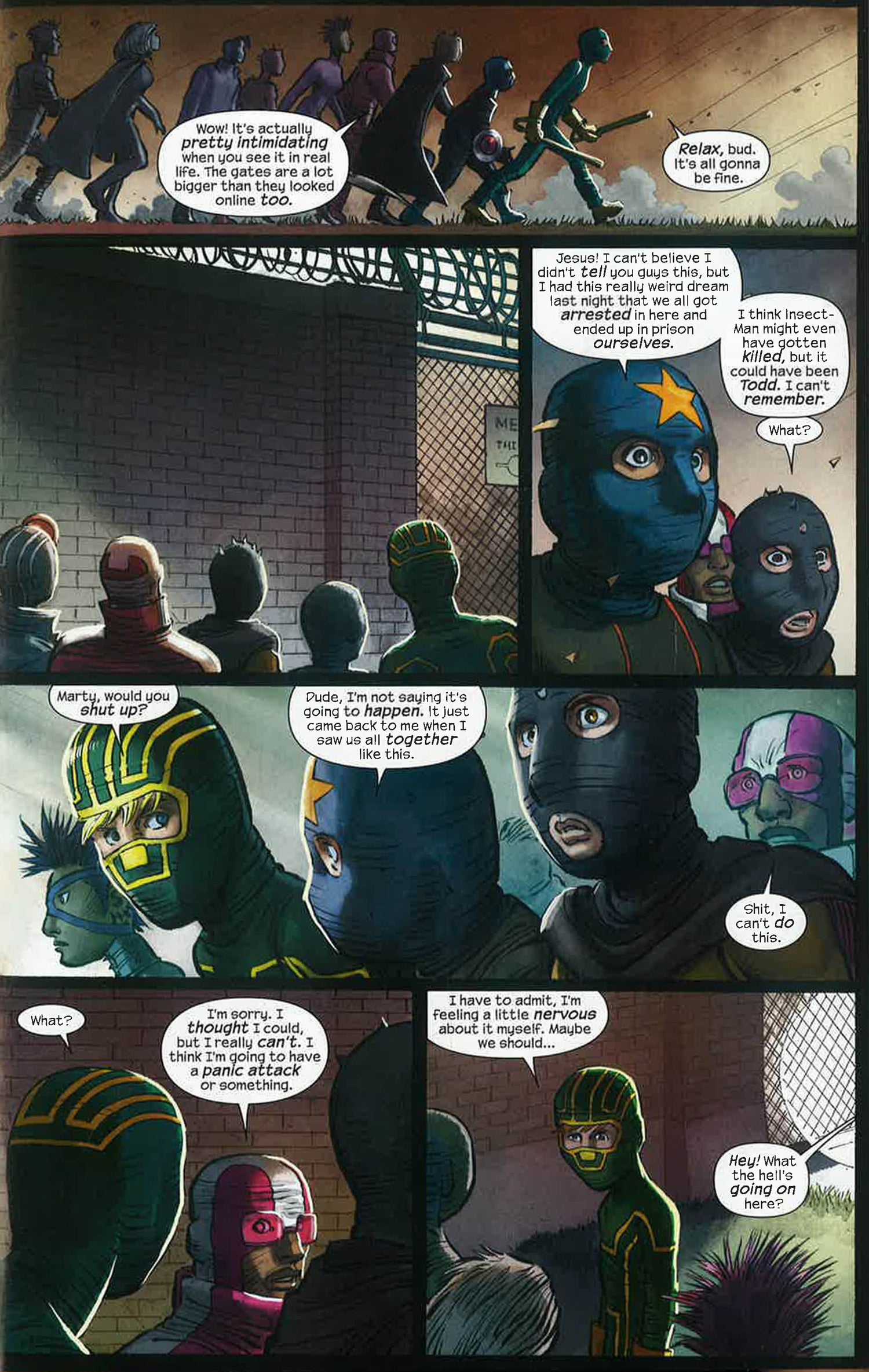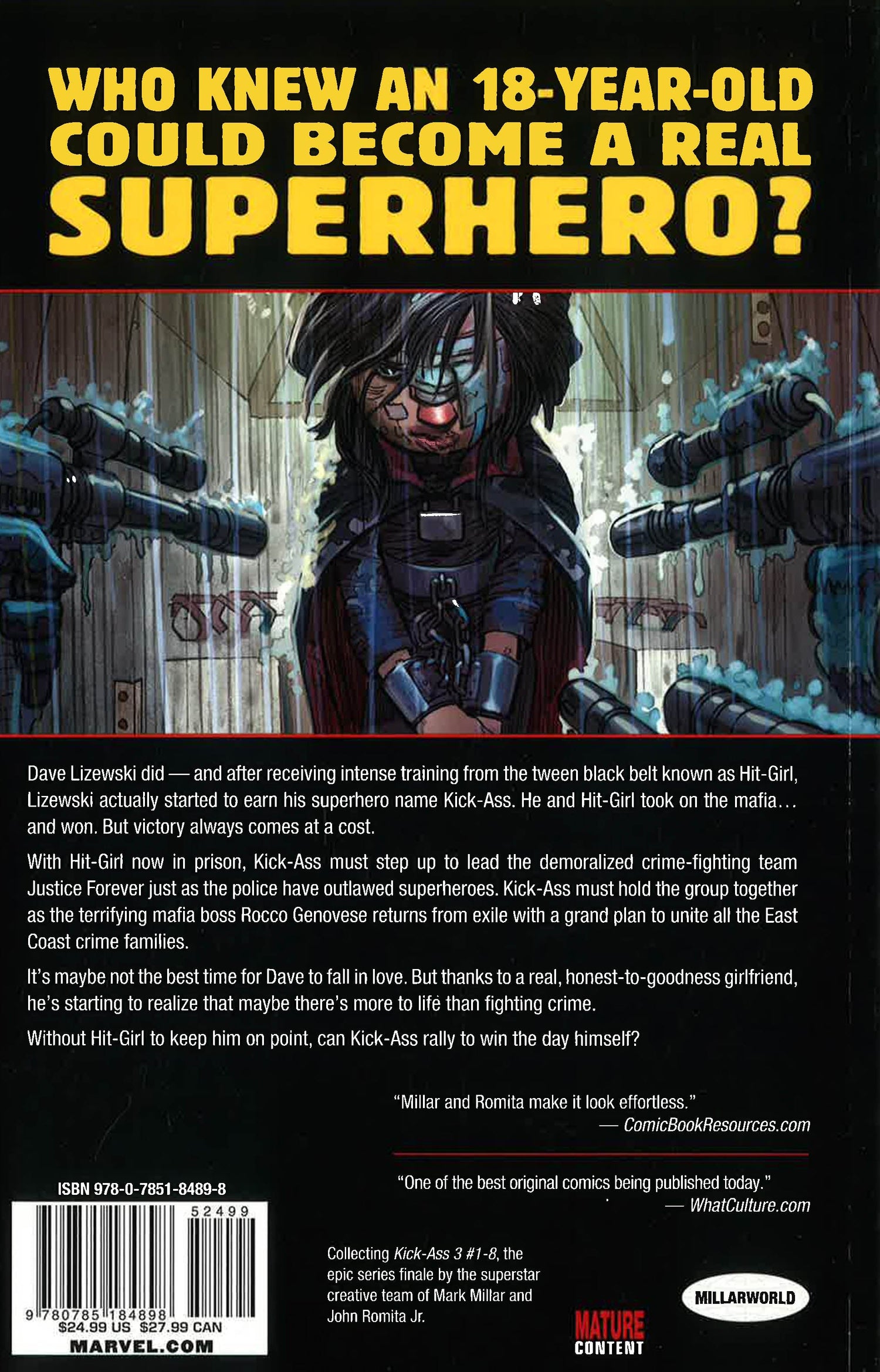 The grand finale of Mark Millar and John Romita Jr.'s blockbuster! With Hit-Girl in jail, Kick-Ass must lead the super-hero team Justice Forever. But heroes have been outlawed, leaving Kick-Ass to dodge both cops and some terrifying new foes! For the first time, Kick-Ass begins to doubt. Is he in too deep? Meanwhile, Hit-Girl starts running all the gangs in the joint, and a broken Red Mist gets an education from a terrifying crime boss. Soon every costumed hero is not only running from the law...they're running for their lives. As the body count rises, Kick-Ass must decide if bringing justice to the city is truly worth the price. Plus: the secret origin of Hit-Girl! How did litt le Mindy McCready earn her assassin stripes? Find out as KICK-ASS comes to its epic conclusion! COLLECTING: KICK-ASS 3 1-8