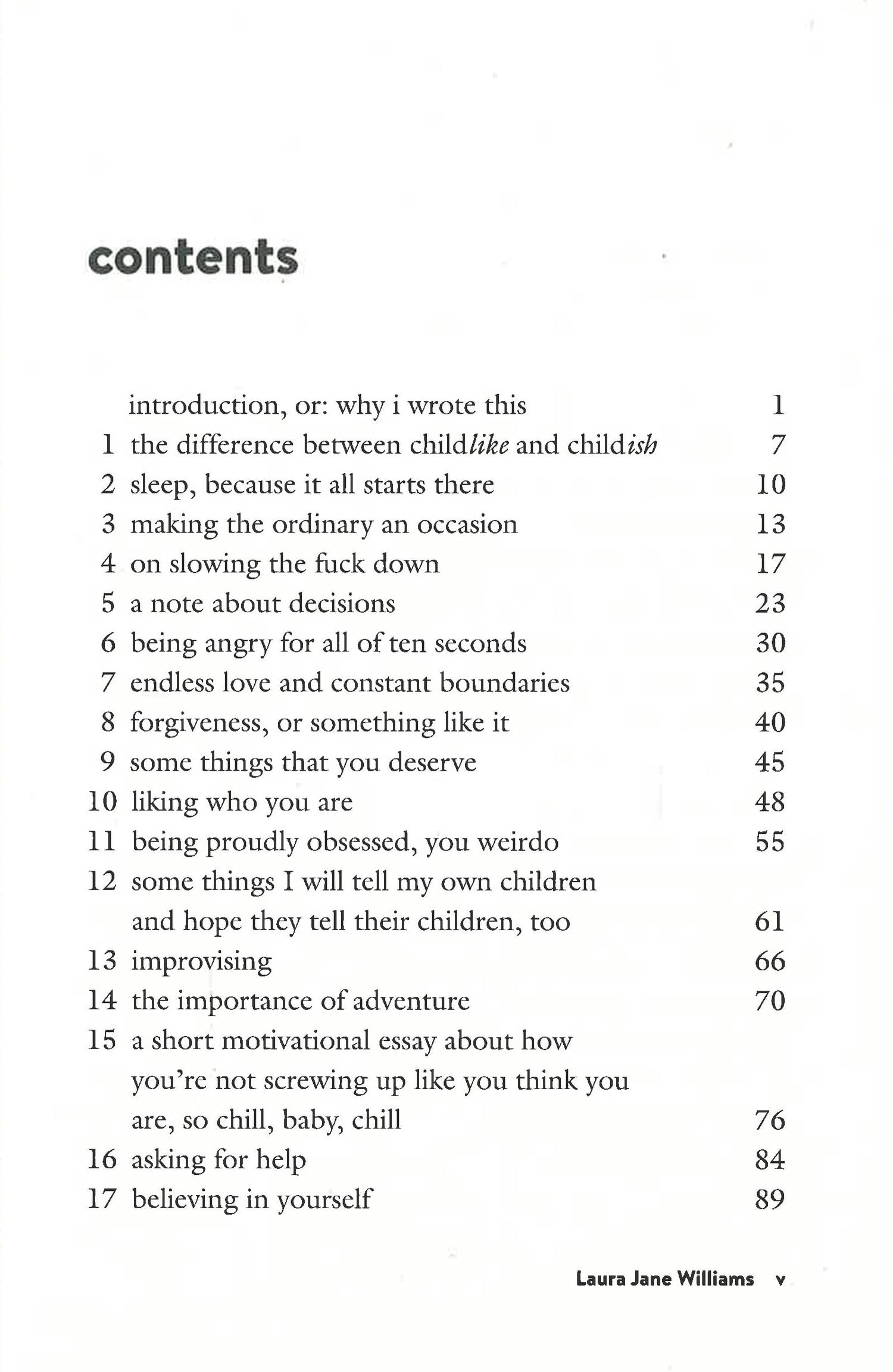 Author Laura Jane Williams argues that you can be an adult but still embrace childlike (not childish) tendencies: you can own your own home and still want to build a pillow fort when the mood strikes; you can pay your bills on time and still snuggle something soft against your face because you're sad; you can run a business and still take time to play. Divided into 40 short lessons, it's an accessible, fun introduction to the self-help world that anyone can stomach.