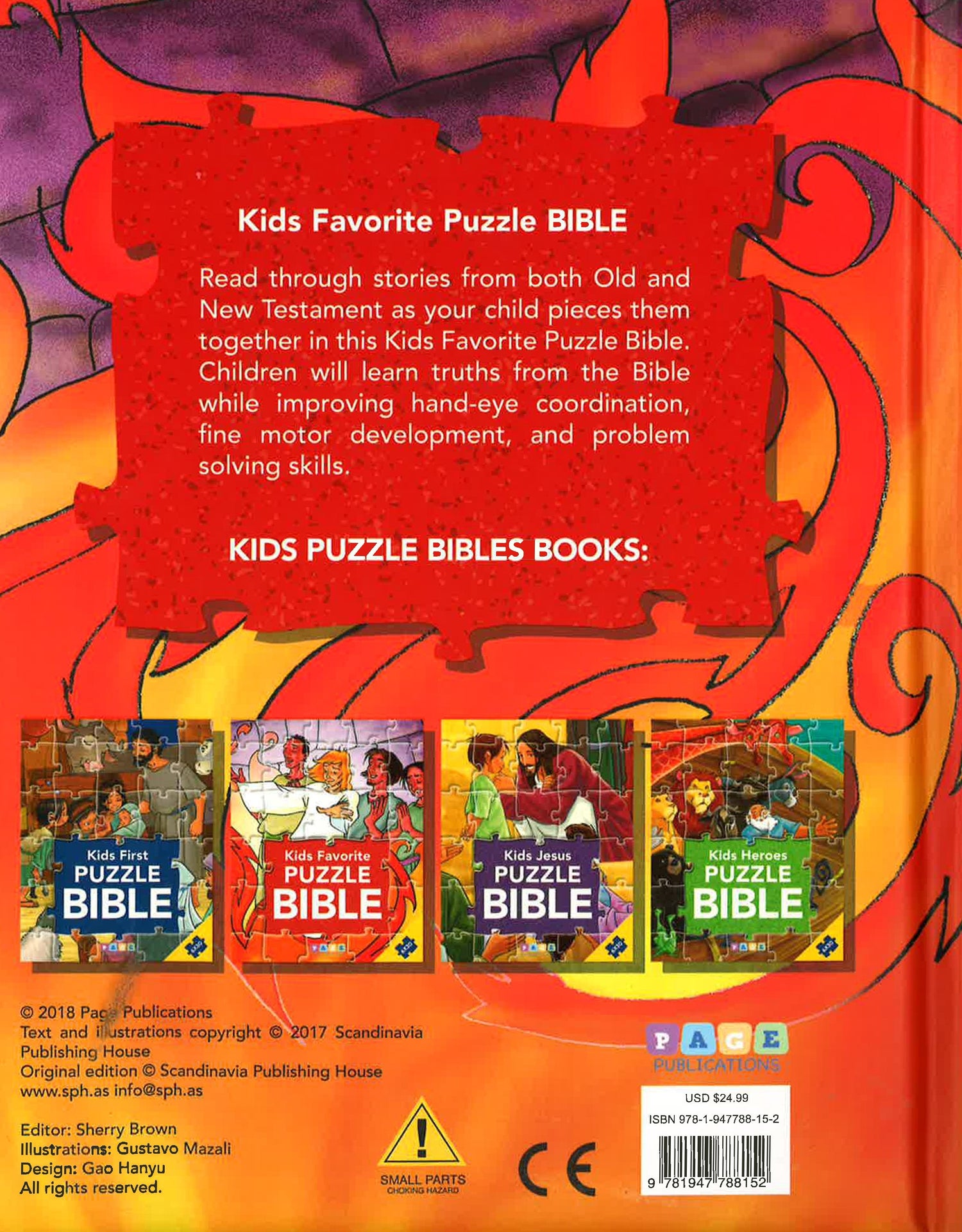 Read through stories from both Old and New Testament as your child pieces them together in this Kids Favorite Puzzle Bible. Children will learn truths from the Bible while improving hands-eye coordination, fine motor development, and problem solving skills. 2 IN 1, Puzzle and a book!