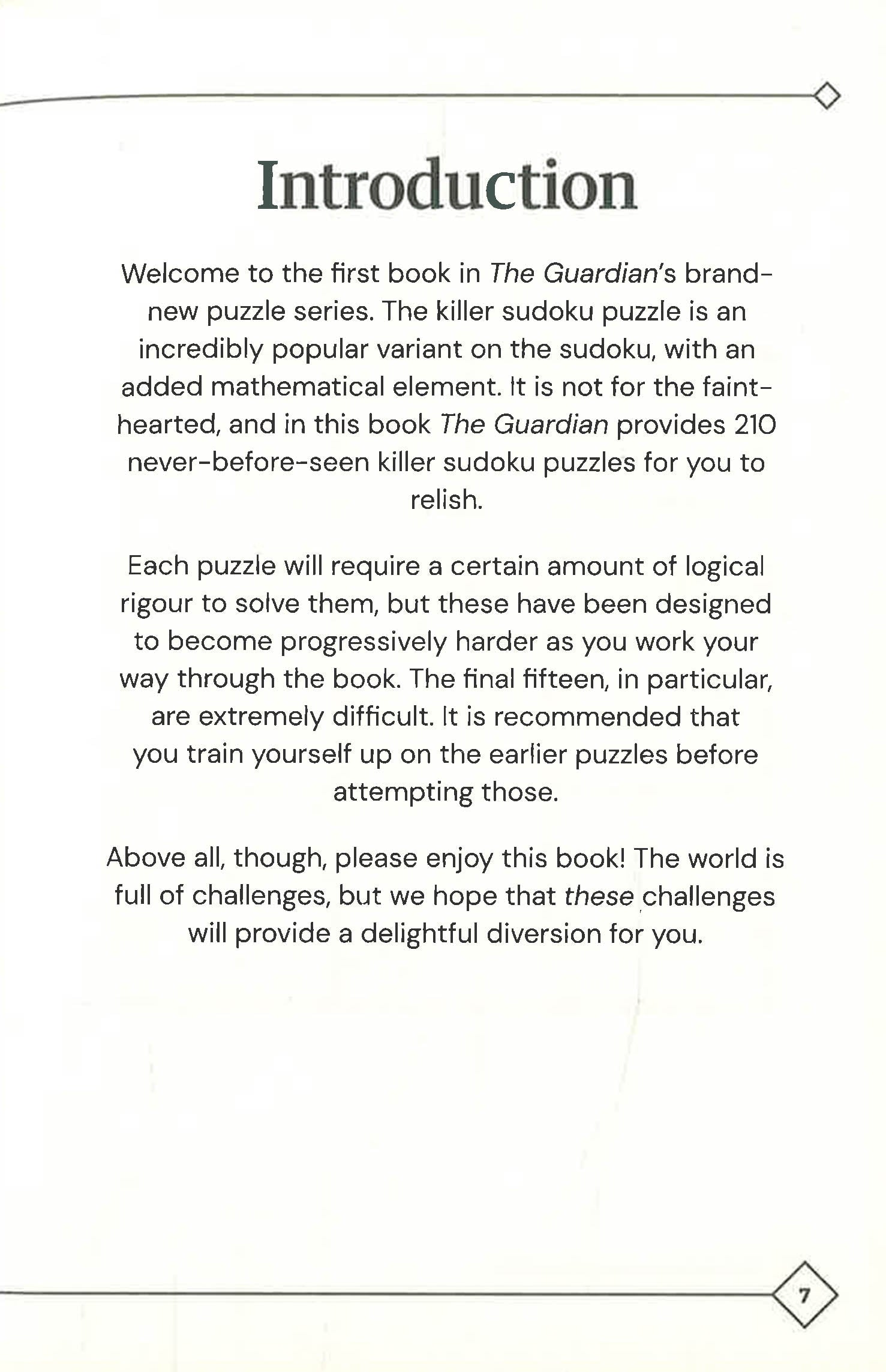 The Guardian's killer sudoku puzzles are enjoyed by hundreds of thousands of people every day. While only a minimal level of mathematical knowledge is needed, all of your logical reasoning will be required to solve these brand-new puzzles. The puzzles have been designed to increase in difficulty as the book progresses, meaning this book can be enjoyed by novice and master alike.
