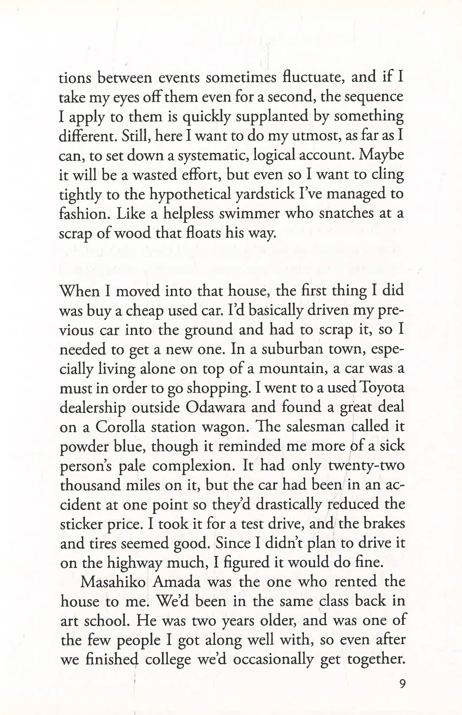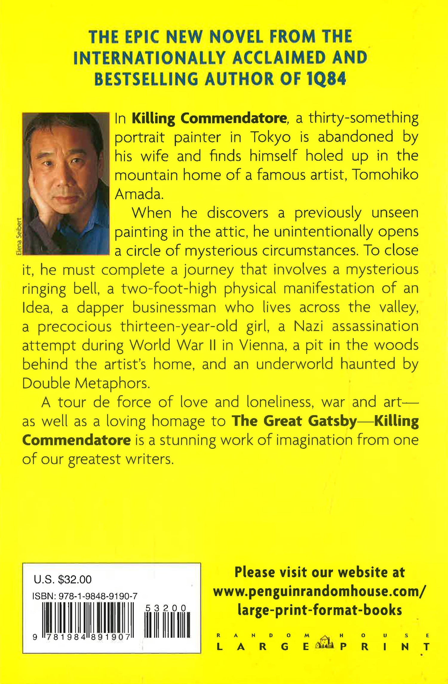 In Killing Commendatore, a thirty-something portrait painter in Tokyo is abandoned by his wife and finds himself holed up in the mountain home of a famous artist, Tomohiko Amada. When he discovers a previously unseen painting in the attic, he unintentionally opens a circle of mysterious circumstances. To close it, he must complete a journey that involves a mysterious ringing bell, a two-foot-high physical manifestation of an Idea, a dapper businessman who lives across the valley, a precocious thirteen-year-old girl, a Nazi assassination attempt during World War II in Vienna, a pit in the woods behind the artist's home, and an underworld haunted by Double Metaphors. A tour de force of love and loneliness, war and art--as well as a loving homage to The Great Gatsby--Killing Commendatore is a stunning work of imagination from one of our greatest writers.