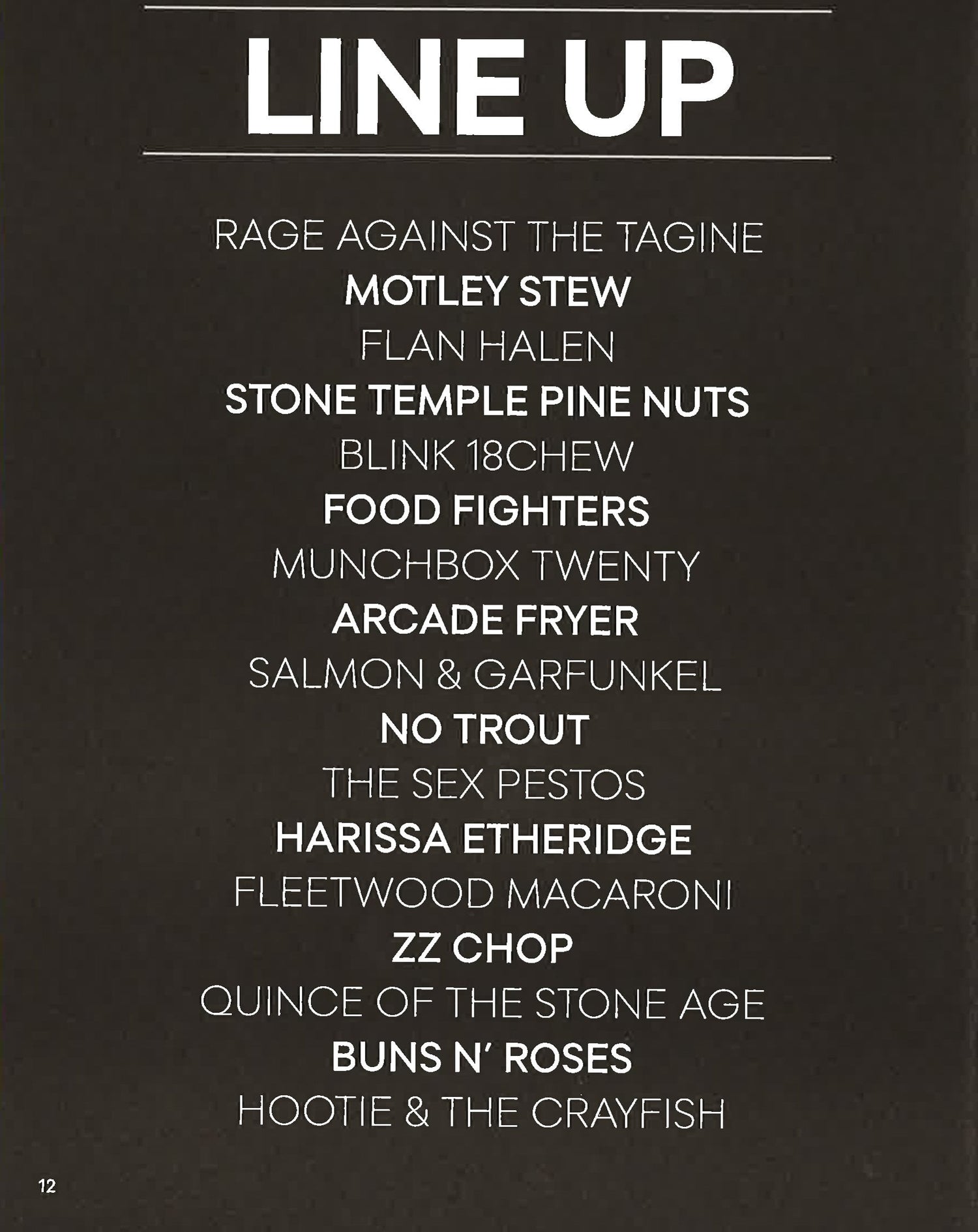 Recipes include Papadum Preach, Summer of 60 Naan, Smells Like Terrine Spirit, Gherkin Nine to Five, Fight For Your Right to Pate, Little Red Courgette and many more.