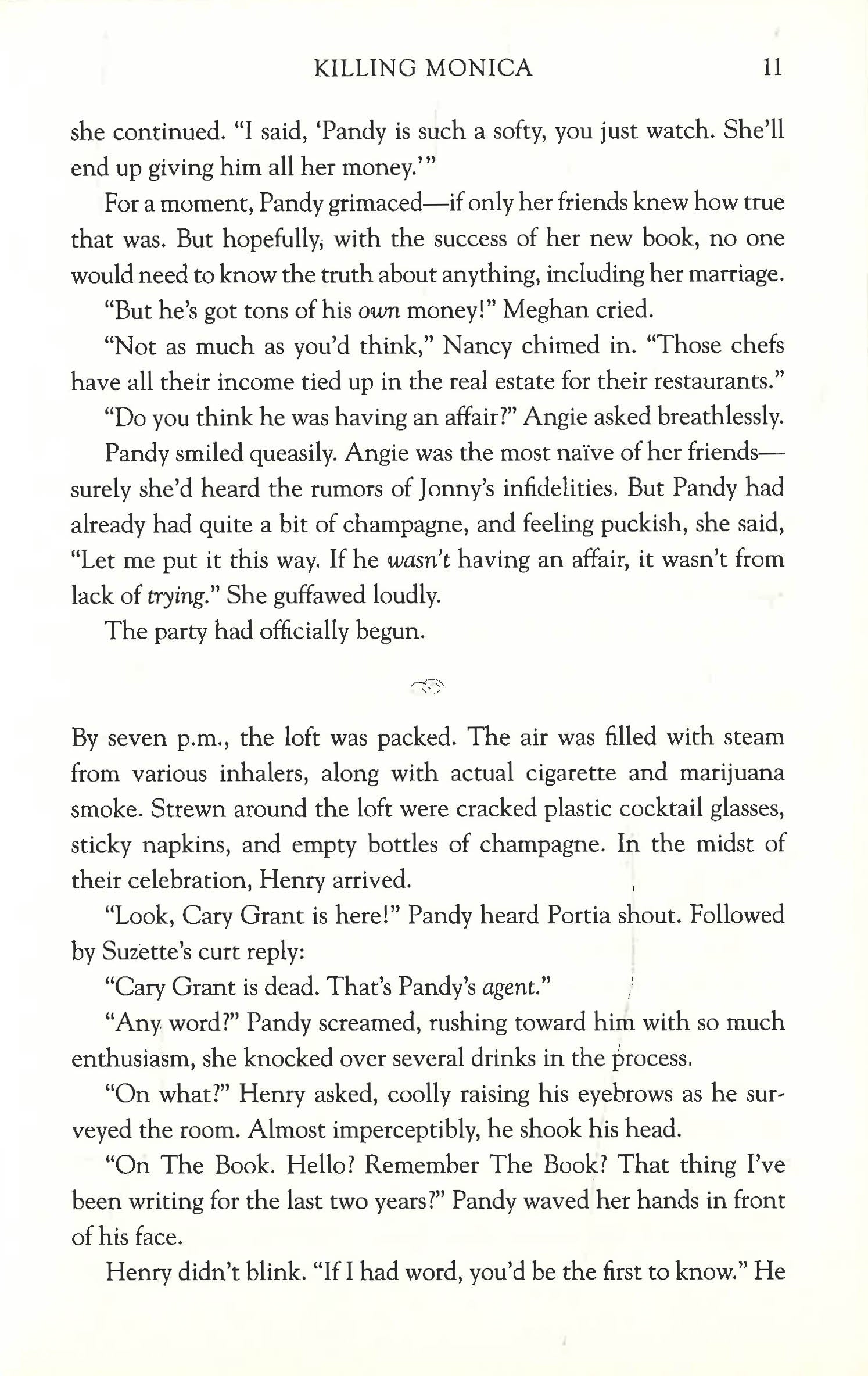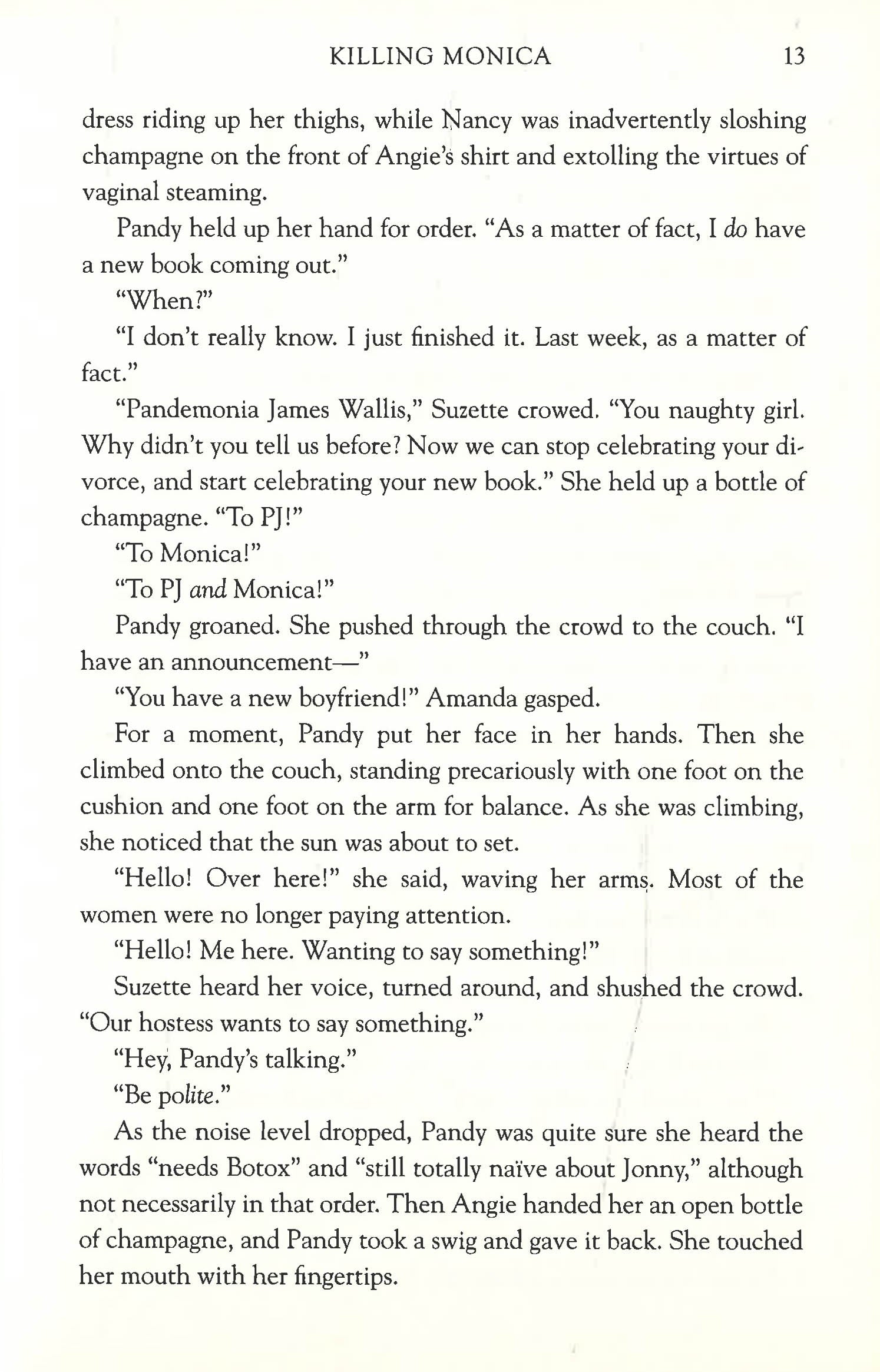Pandy "PJ" Wallis is a renowned writer whose novels about a young woman making her way in Manhattan have spawned a series of blockbuster films. After the success of the Monica books and movies, Pandy wants to attempt something different: a historical novel based on her ancestor Lady Wallis. But Pandy's publishers and audience only want her to keep cranking out more Monica-as does her greedy husband, Jonny, who's gone deeply in debt to finance his new restaurant in Las Vegas. When her marriage crumbles and the boathouse of her family home in Connecticut goes up in flames, Pandy suddenly realizes she has an opportunity to reinvent herself. But to do so, she will have to reconcile with her ex-best friend and former partner in crime, SondraBeth Schnowzer, who plays Monica on the big screen-and who may have her own reasons to derail Pandy's startling change of plan.In KILLING MONICA, Candace Bushnell spoofs and skewers her way through pop culture, celebrity worship, fame, and the meaning of identity. With her trademark humor and style, this is Bushnell's sharpest, funniest book to date.