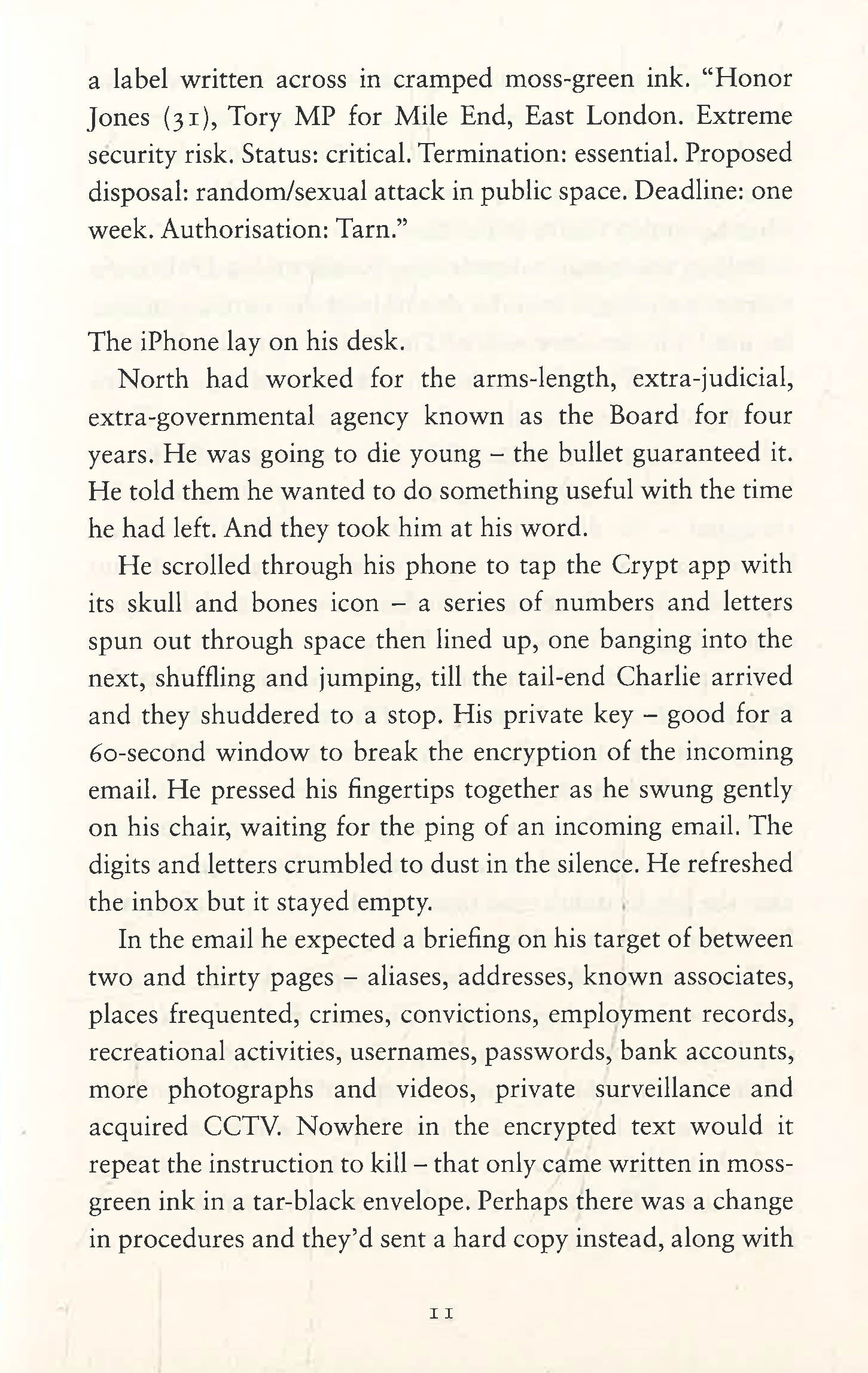 Michael North, assassin and spy-for-hire, is very good at killing bad guys. But what happens when his shadowy bosses at the dark heart of the British government order him to kill a good woman instead?