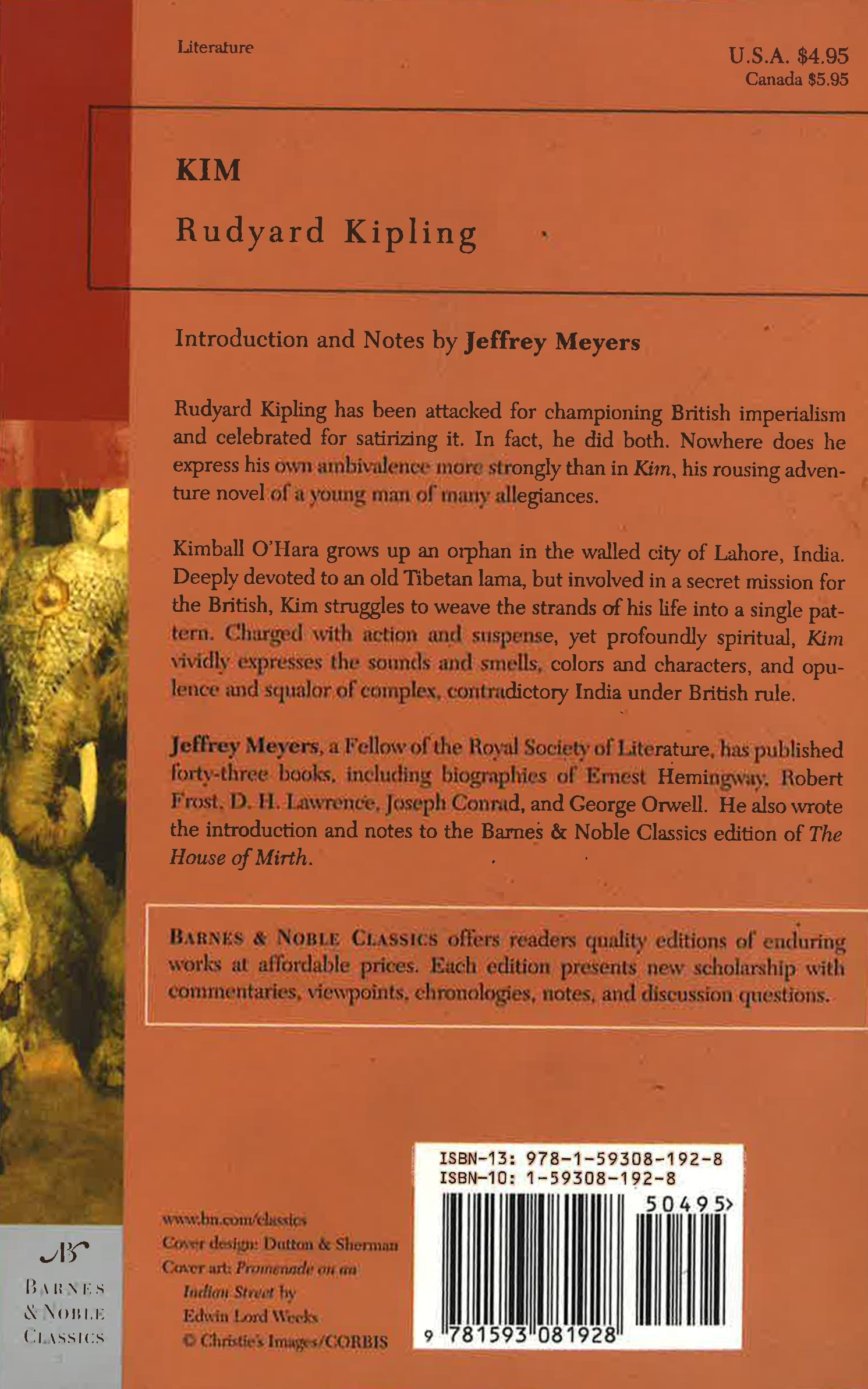 Kimball O'Hara grows up an orphan in the walled city of Lahore, India. Deeply devoted to an old Tibetan lama but involved in a secret mission for the British, Kim struggles to weave the strands of his life into a single pattern. Charged with action and suspense, yet profoundly spiritual, Kim vividly expresses the sounds and smells, colors and characters, opulence and squalor of complex, contradictory India under British rule.
