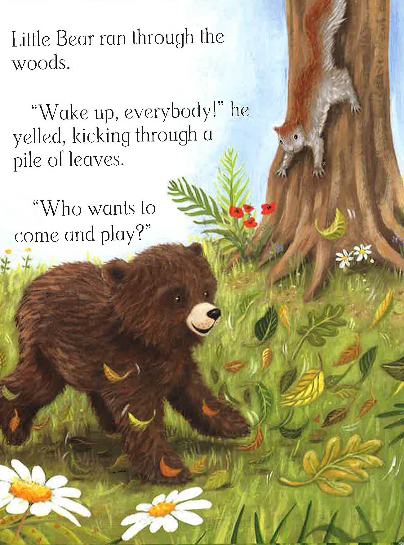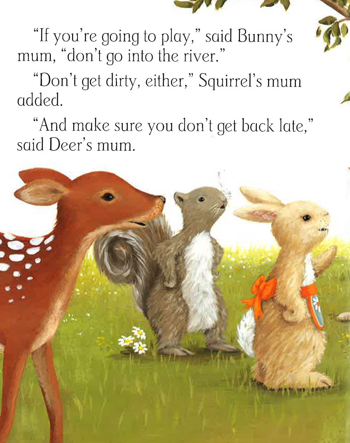 When Bear calls for his friends to play, their moms tell them they musn't go in the river, get dirty, or be late coming home. But when they return later, have they done as they were told?