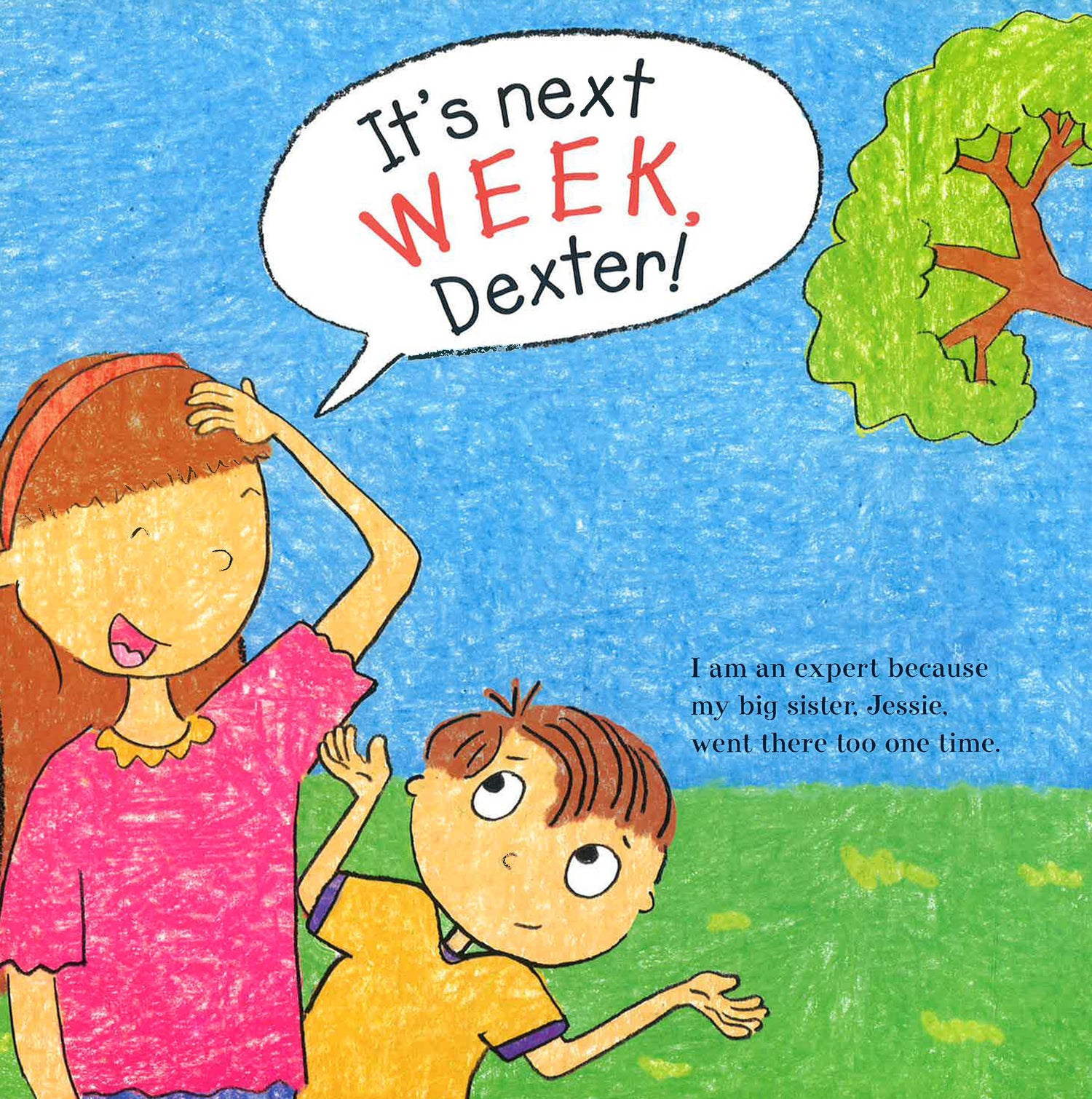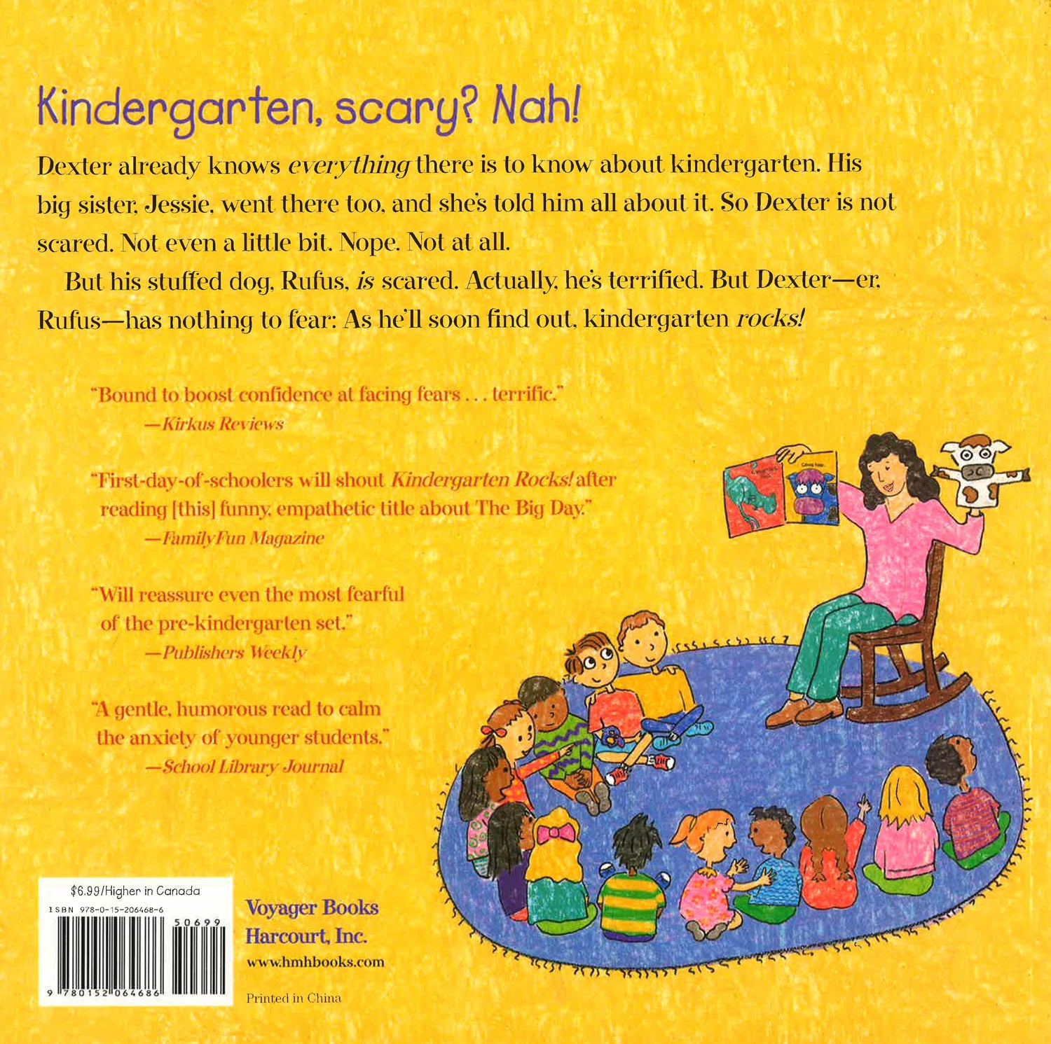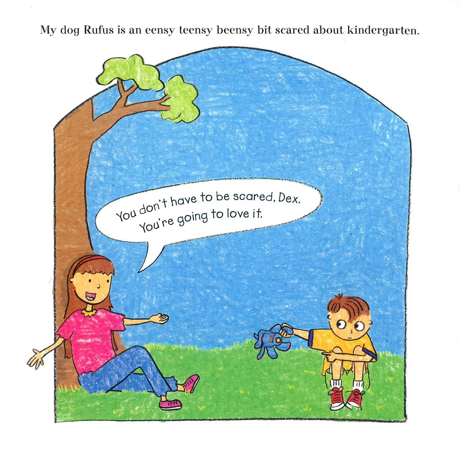 Dexter Dugan is starting kindergarten and his stuffed dog Rufus is terrified for him. Thankfully, third grader and older sister extraordinaire Jessie is there to patiently answer all of Dexter's--er, Rufus's--questions. Dex's first day is filled with exciting new things like a delightful teacher and a lunchroom that looks like a restaurant! But when Dex loses Rufus during recess, will Jessie come to the rescue before the final bell rings? Katie Davis's crayon-like illustrations and lighthearted tone will reassure any new student's cornucopia of fears and boost their confidence in this humorous story about facing your fears . . . after all, kindergarten rocks!