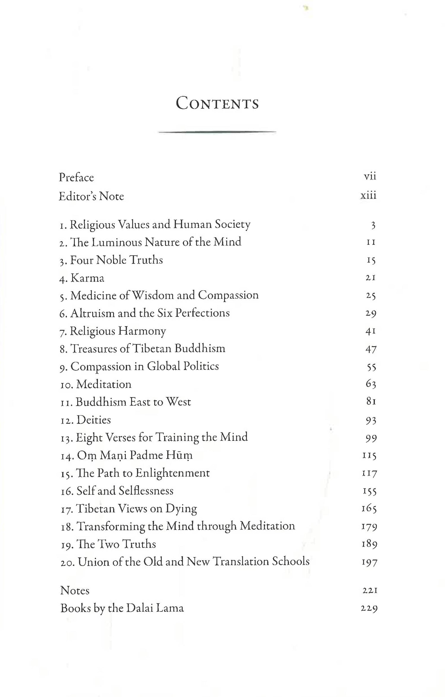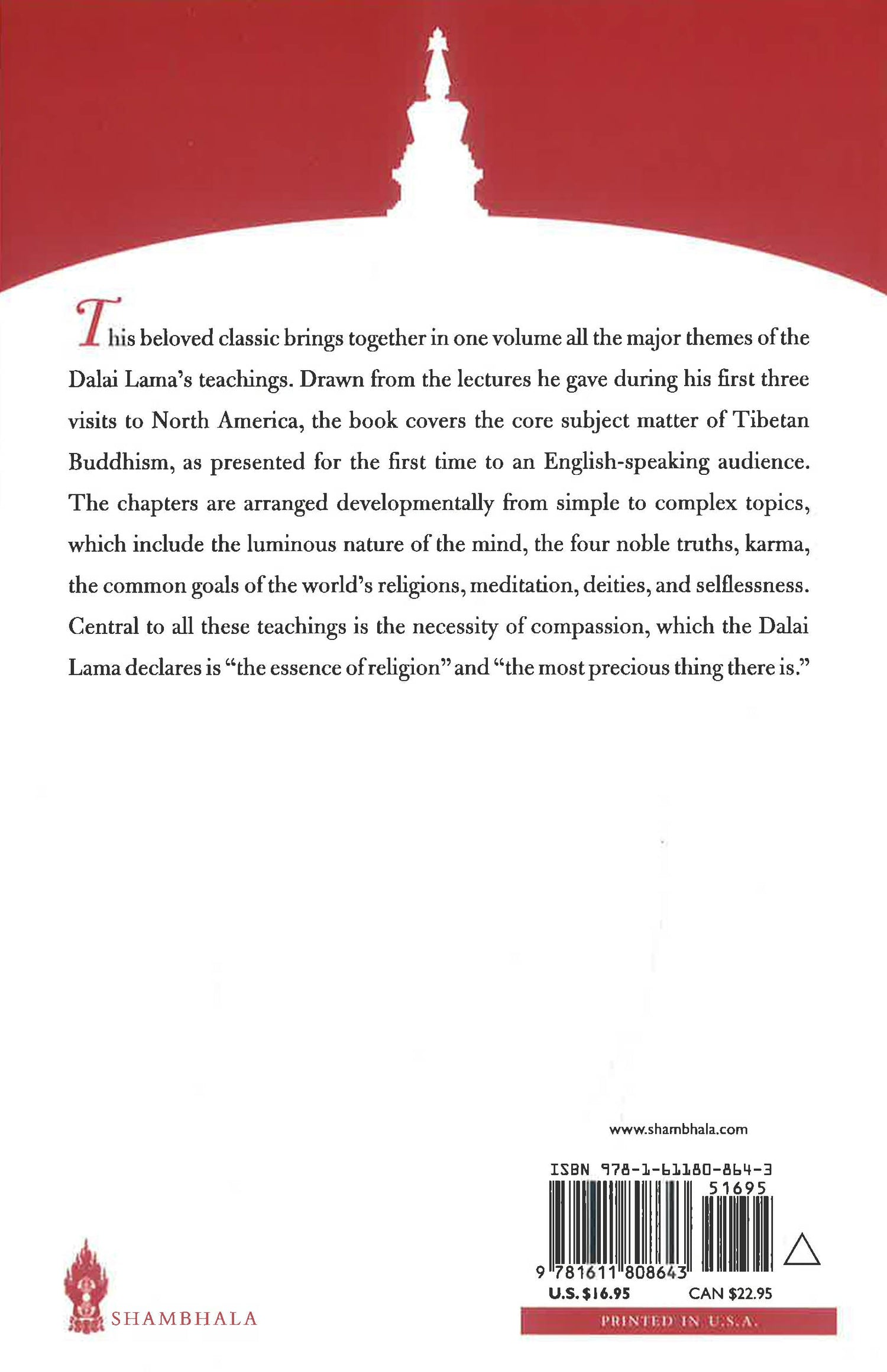 Drawn from the lectures he gave during his first three visits to North America, the book covers the core subject matter of Tibetan Buddhism, as presented for the first time to an English-speaking audience. The chapters are arranged developmentally from simple to complex topics, which include the luminous nature of the mind, the four noble truths, karma, the common goals of the world's religions, meditation, deities, and selflessness. Central to all these teachings is the necessity of compassion--which the Dalai Lama says is the essence of religion and the most precious thing there is.
