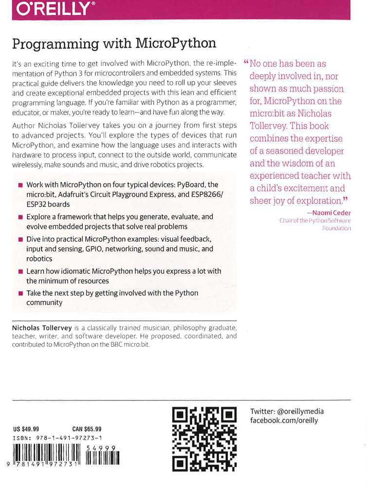 It's an exciting time to get involved with MicroPython, the re-implementation of Python 3 for microcontrollers and embedded systems. This practical guide delivers the knowledge you need to roll up your sleeves and create exceptional embedded projects with this lean and efficient programming language. If you're familiar with Python as a programmer, educator, or maker, you're ready to learn-and have fun along the way. Author Nicholas Tollervey takes you on a journey from first steps to advanced projects. You'll explore the types of devices that run MicroPython, and examine how the language uses and interacts with hardware to process input, connect to the outside world, communicate wirelessly, make sounds and music, and drive robotics projects. Work with MicroPython on four typical devices: PyBoard, the micro:bit, Adafruit's Circuit Playground Express, and ESP8266/ESP32 boards Explore a framework that helps you generate, evaluate, and evolve embedded projects that solve real problems Dive into practical MicroPython examples: visual feedback, input and sensing, GPIO, networking, sound and music, and robotics Learn how idiomatic MicroPython helps you express a lot with the minimum of resources Take the next step by getting involved with the Python community