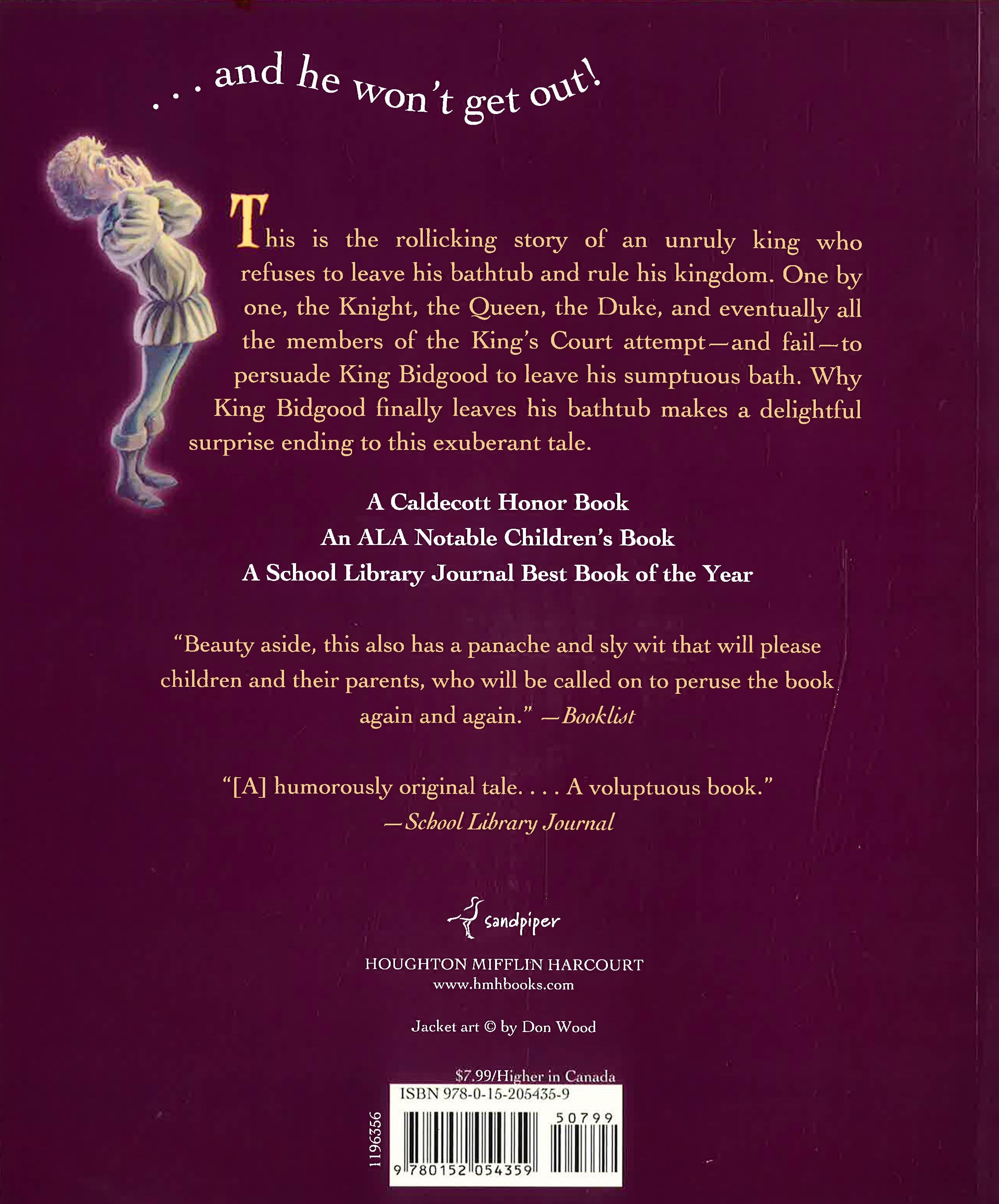 In this delightful story, the king refuses to leave his bathtub and rule the kingdom. One by one, the Knight, the Queen, the Duke, and eventually all the members of the King's Court attempt - and fail - to persuade King Bidgood to leave his sumptuous bath. Why King Bidgood finally leaves his bathtub makes a delightful surprise ending to this exuberant tale.