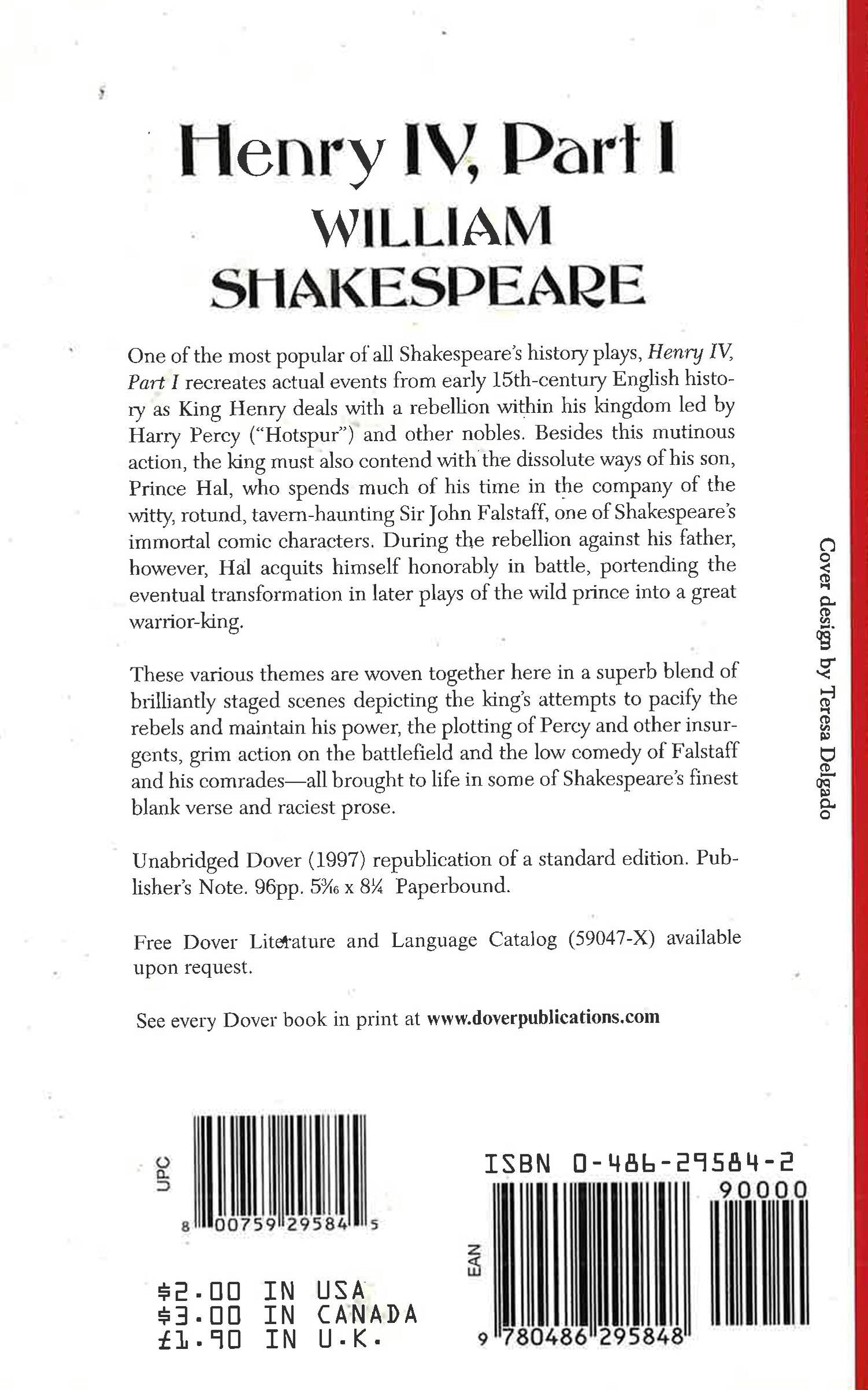 One of the most popular of all Shakespeare's history plays, Henry IV, Part I re-creates actual events from early-15th-century English history as King Henry deals a rebellion inside with his kingdom led by Harry Percy ("Hotspur") and other notables. Besides this mutinous action, the king must also contend with the dissolute ways of his son, Prince Hal, who spends much of his time in the company of the witty, rotund, tavern-haunting Sir John Falstaff, one of Shakespeare's immortal comic characters. During the rebellion against his father, however, Hal acquits himself honorably in battle, portending the eventual transformation in later plays of the wild prince into a great warrior-king.