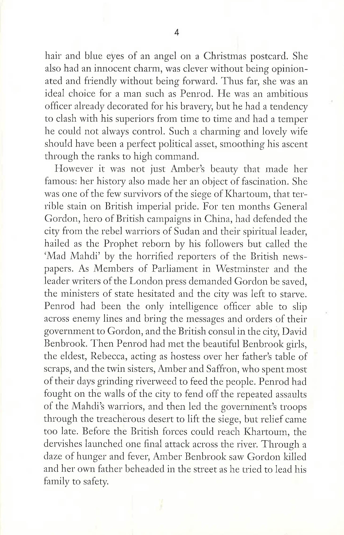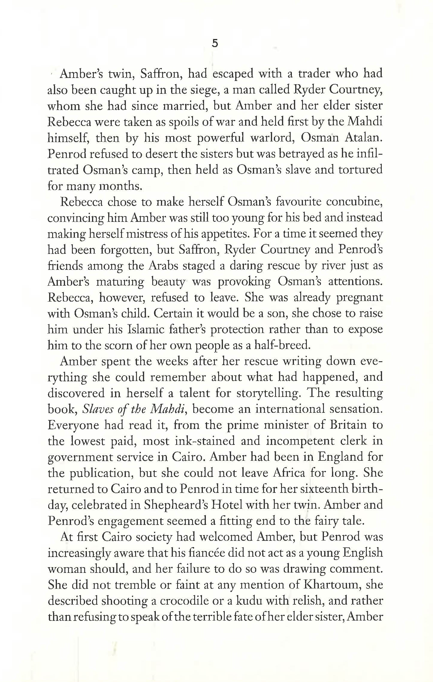 But when Penrod's jealous former lover, Lady Agatha, plants doubt about his character, Amber leaves him and travels to the wilds of Abyssinia with her twin sister, Saffron, and her adventurer husband, Ryder Courtney. On a mission to establish a silver mine, they make the dangerous journey to the new capital of Addis Ababa, where they are welcomed by King Menelik II, the King of Kings. He knows of a plot to invade his beloved Abyssinia, and he needs the Courtneys to help him win.