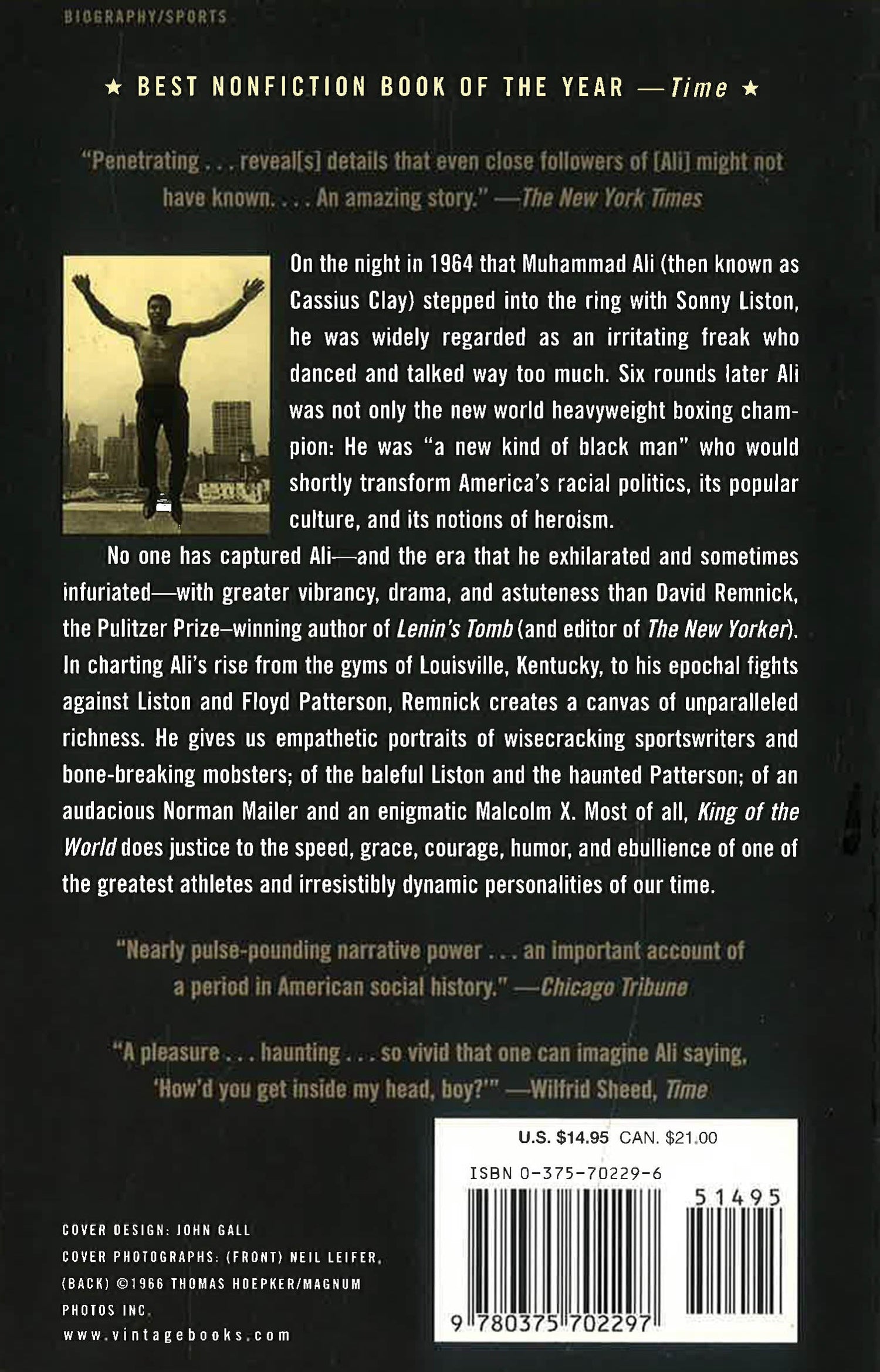 No one has captured Ali--and the era that he exhilarated and sometimes infuriated--with greater vibrancy, drama, and astuteness than David Remnick, the Pulitzer Prize-winning author of Lenin's Tomb (and editor of The New Yorker). In charting Ali's rise from the gyms of Louisville, Kentucky, to his epochal fights against Liston and Floyd Patterson, Remnick creates a canvas of unparalleled richness. He gives us empathetic portraits of wisecracking sportswriters and bone-breaking mobsters; of the baleful Liston and the haunted Patterson; of an audacious Norman Mailer and an enigmatic Malcolm X. Most of all, King of the World does justice to the speed, grace, courage, humor, and ebullience of one of the greatest athletes and irresistibly dynamic personalities of our time.