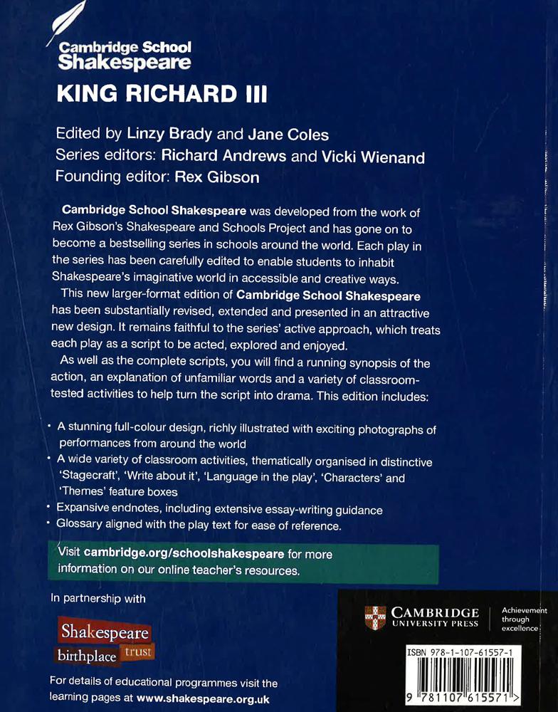An improved, larger-format edition of the Cambridge School Shakespeare plays, extensively rewritten, expanded and produced in an attractive new design. The Rex Gibson active approach to classroom Shakespeare enables students to inhabit Shakespeare's imaginative world in accessible and creative ways, sharing Shakespeare's love of language, interest in character and sense of theatre. Substantially revised and extended, classroom activities are thematically organised in distinctive stagecraft, writing, language, characters and themes features. Expanded endnotes include extensive essay-writing guidance for 'King Richard III' and Shakespeare, and extended glossaries are aligned with the play text for easy reference. Includes rich, exciting colour photos of global performances of 'King Richard III'. Further support material available at www.cambridgeschoolshakespeare.com