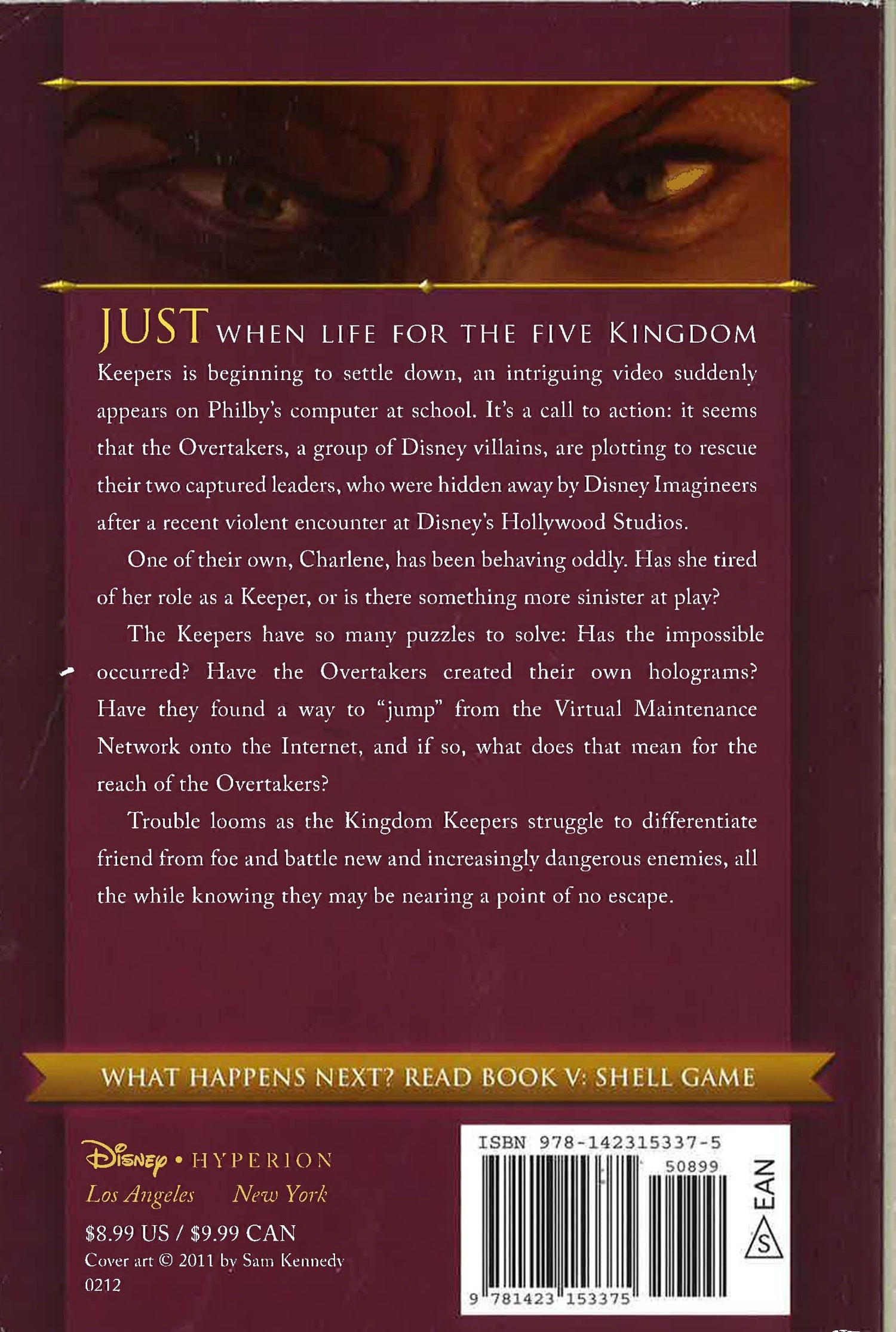 For the five teens who modeled as Disney Hologram Imaging hosts, life is beginning to settle down when an intriguing video arrives to Philby's computer at school. It's a call for action: the Overtakers, a group of Disney villains, seem to be plotting to attempt a rescue of two of their leaders, both of whom the Disney Imagineers have hidden away somewhere following a violent encounter in Epcot. A staged attack by new Overtakers at Downtown Disney, startles the group.One of their own, Charlene, is acting strange of late. Has she tired of her role as a Kingdom Keeper or is there something more sinister at play? When caught sneaking into Epcot as her DHI, acting strictly against the group's rules, Finn and Philby take action.Has the "impossible" occurred? Have the Overtakers created their own holograms? Have they found a way to "jump" from the Virtual Maintenance Network onto the Internet, and if so, what does that mean for the safety of the parks, and the spread and reach of the Overtakers? Are they recruiting an army from outside the parks?A dark cloud in the Kingdom Keeper era is unfolding, and with dissension in their own ranks, it's unclear if there's any chance of escape.