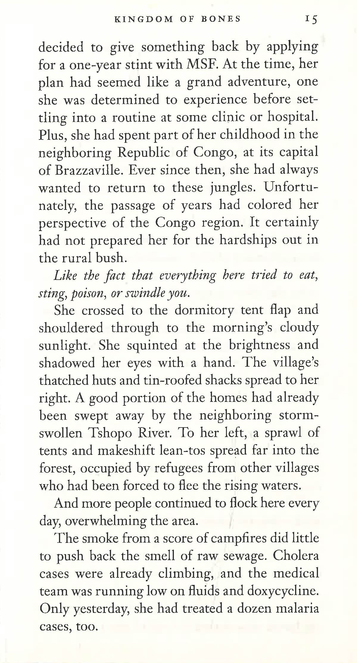 A United Nations relief team in a small village in the Congo makes an alarming discovery. An unknown force is leveling the evolutionary playing field. Men, women, and children have been reduced to a dull, catatonic state. The environment surrounding them—plants and animals—has grown more cunning and predatory, evolving at an exponential pace. The insidious phenomenon is spreading from a cursed site in the jungle — known to locals as the Kingdom of Bones —and sweeping across Africa, threatening the rest of the world.
