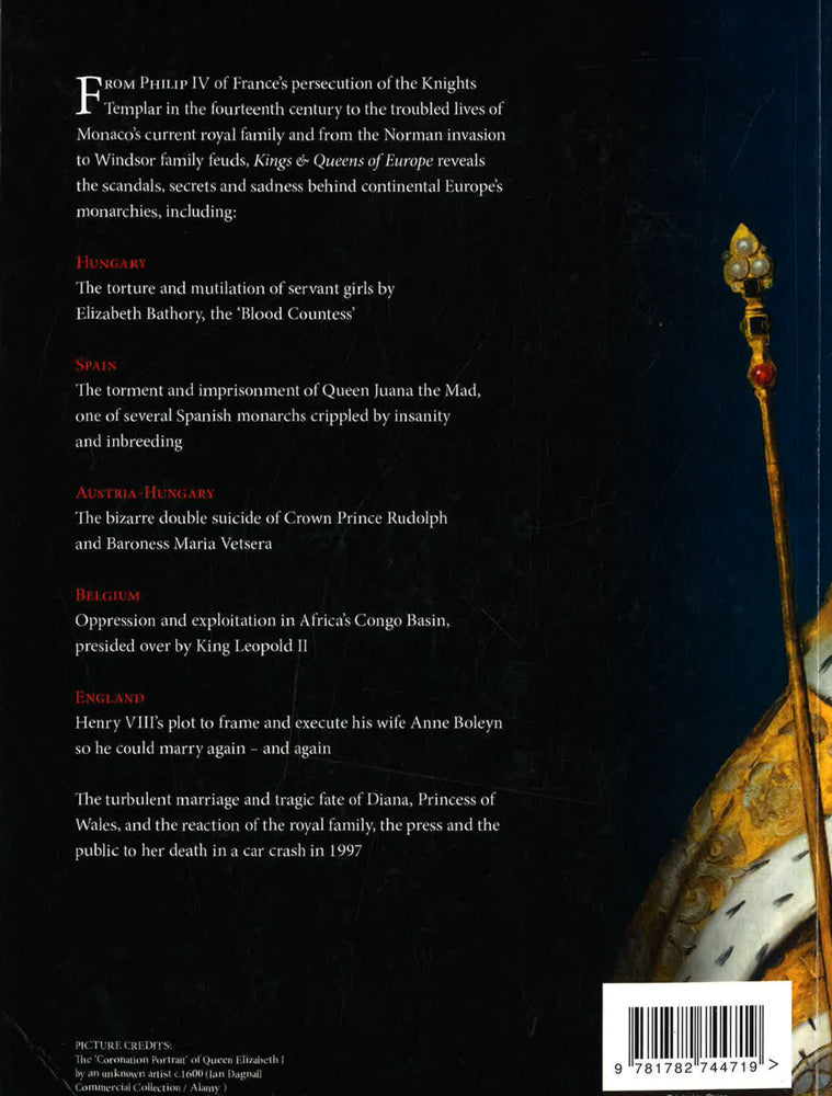 "To be a king and wear a crown is a thing more glorious to them that see it than it is pleasant to them that bear it." - Queen Elizabeth I of England "I shall be an autocrat: that's my trade. And the good Lord will forgive me: that's his." - Catherine the Great To many, Europe has been the pinnacle of world sophistication and culture, yet beneath the power, the glamour and the splendour there has also been scandal, mystery, incest, insanity and skullduggery. Kings and Queens of Europe peels away the glory and the glitz to take a wry look at what has really gone on in the corridors, bedrooms and dungeons of European power from the eleventh century up to the present day. From the Tudors to the Habsburgs to the Windsors, from Vlad the Impaler to Elizabeth Bathory's torture techniques to Philip IV of France's persecution of the Knights Templars, from the tragedies of Princess Grace of Monaco and Princess Diana to the corruption charges facing Princess Cristina of Spain today, Kings and Queens of Europe is illustrated throughout with 400 colour and black-and-white photographs, genealogies and artworks, and offers a lively, highly varied portrait of European monarchy.