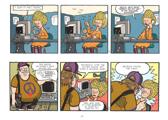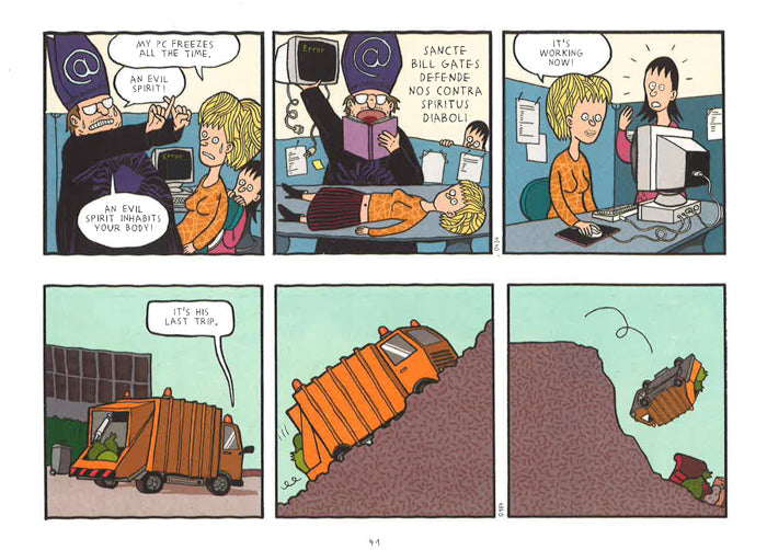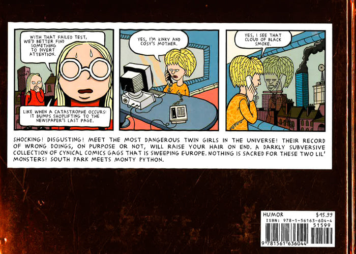 Shocking! Disgusting! Meet the most dangerous twin girls in the universe! Their record of wrong doings, on purpose or not, will raise your hair on end. A darkly subversive collection of cynical comics gags that is sweeping Europe. Nothing is sacred for these two lil monsters! South Park meets Monty Python."