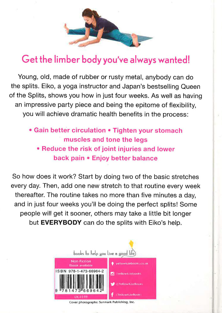 Young, old, made of rubber or rusty metal, anybody can do the splits. Eiko, a yoga instructor from Japan, teaches you how in just four weeks and you can achieve dramatic health benefits in the process. Most people wish they could be more flexible, or even just feel better as they get out of bed every morning. Doing the splits is seen as the epitome of flexibility, but it also has previously unrecognized, often dramatic health benefits: