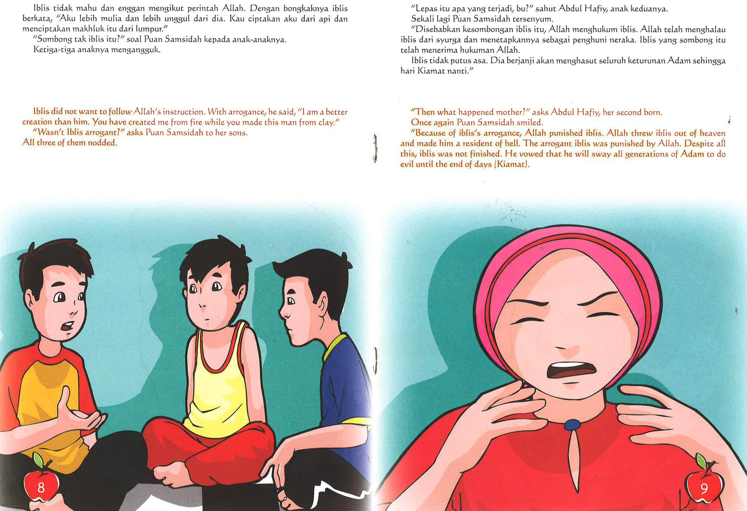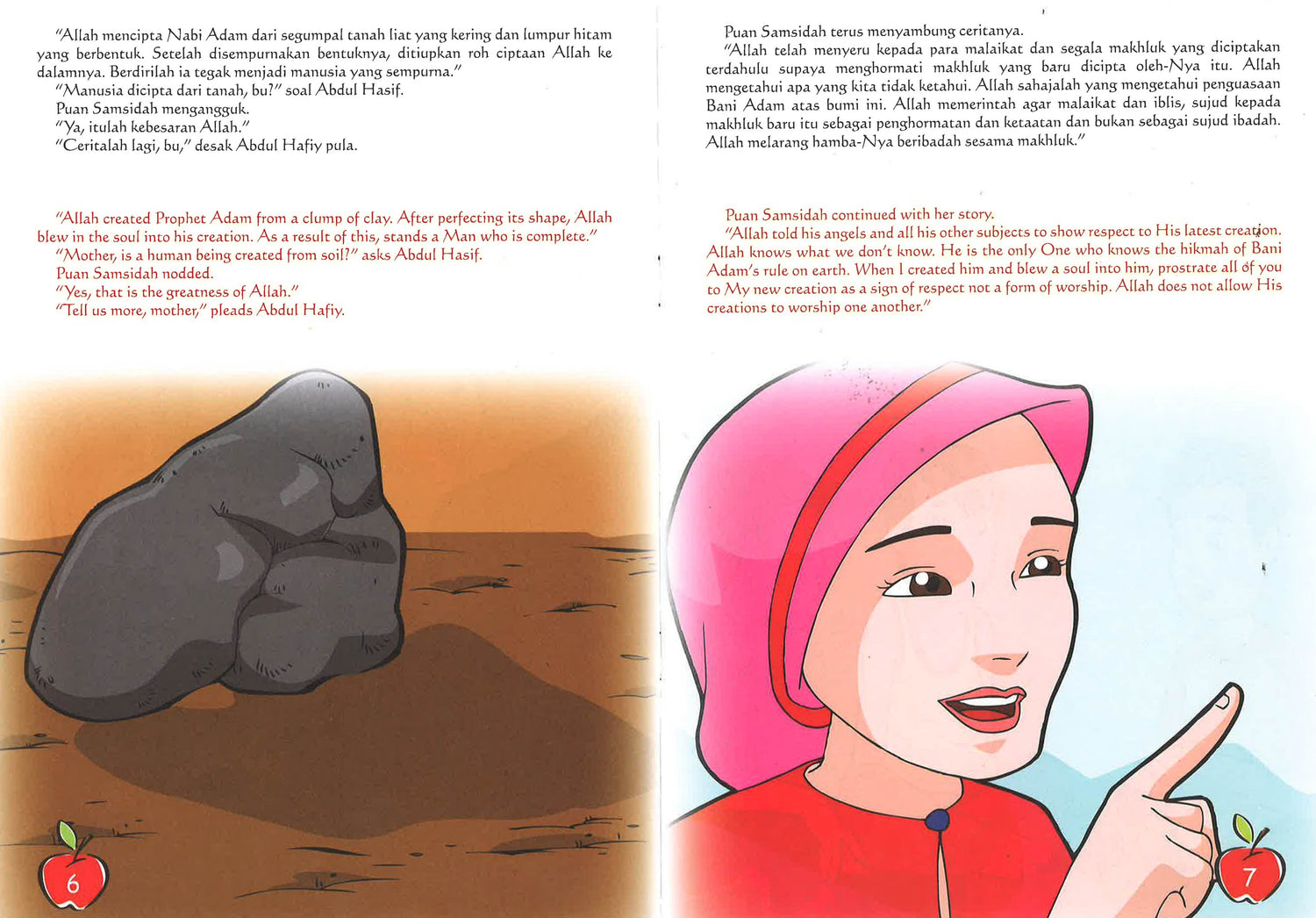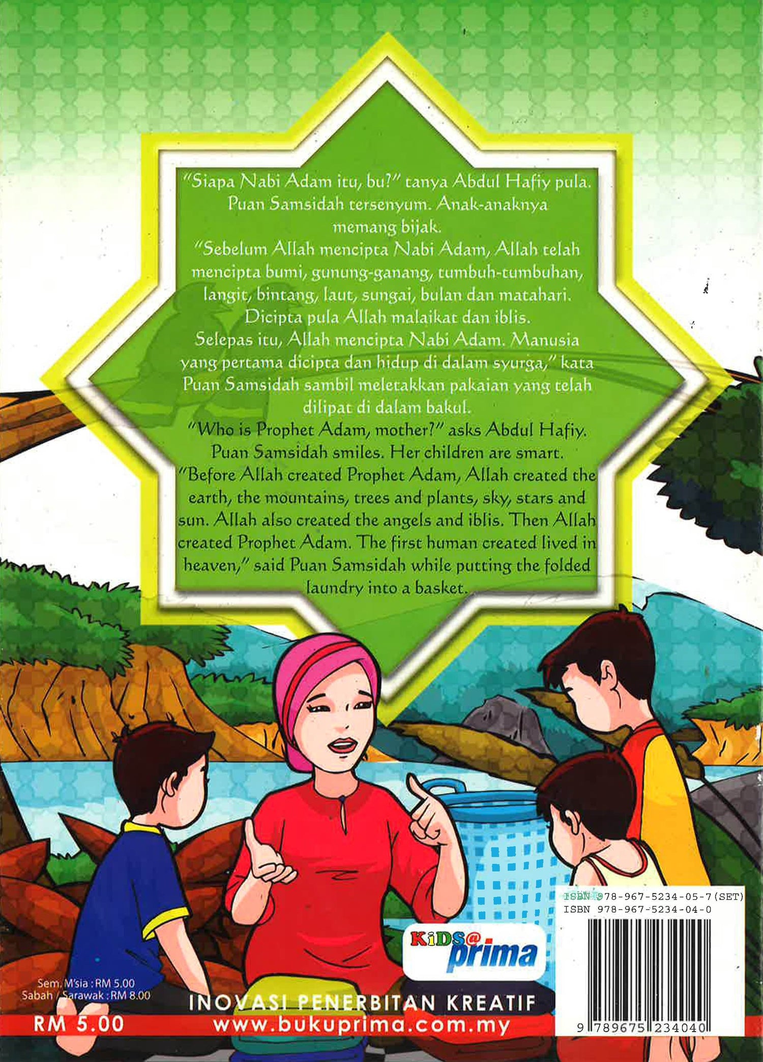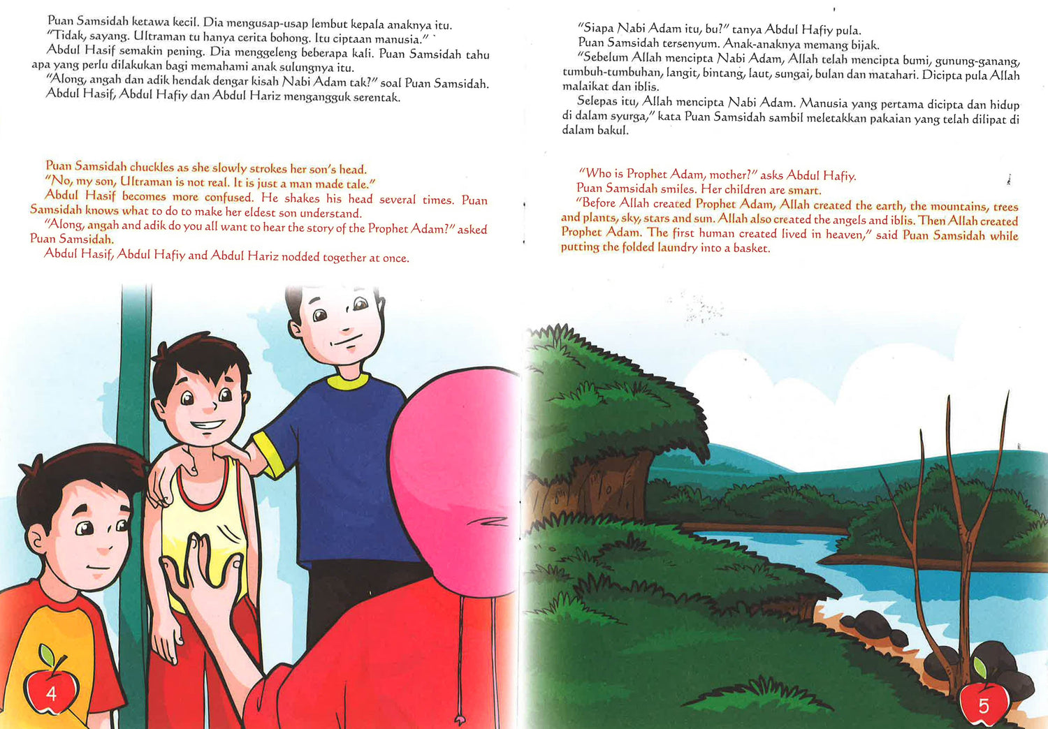 "Siapa Nabi Adam itu, be? tanya Abdul Hafiy pula. Puan Samsidah tersenyum. Anak-anaknya memang bijak. "Sebelum Allah mencipta Nabi Adam, Allah telah mencipta bumi, gunung-ganang, tumbuh-tumbuhan, langit, bintang, laut, sungai, bulan dan matahari. Dicipta pula AIlah malaikat dan iblis. Selepas itu, Allah mencipta Nabi Adam. Manusia yang pertama dicipta dan hidup di dalam syurga,” kata Puan Samsidah sambil meletakkan pakaian yang telah dilipat di dalam bakul.