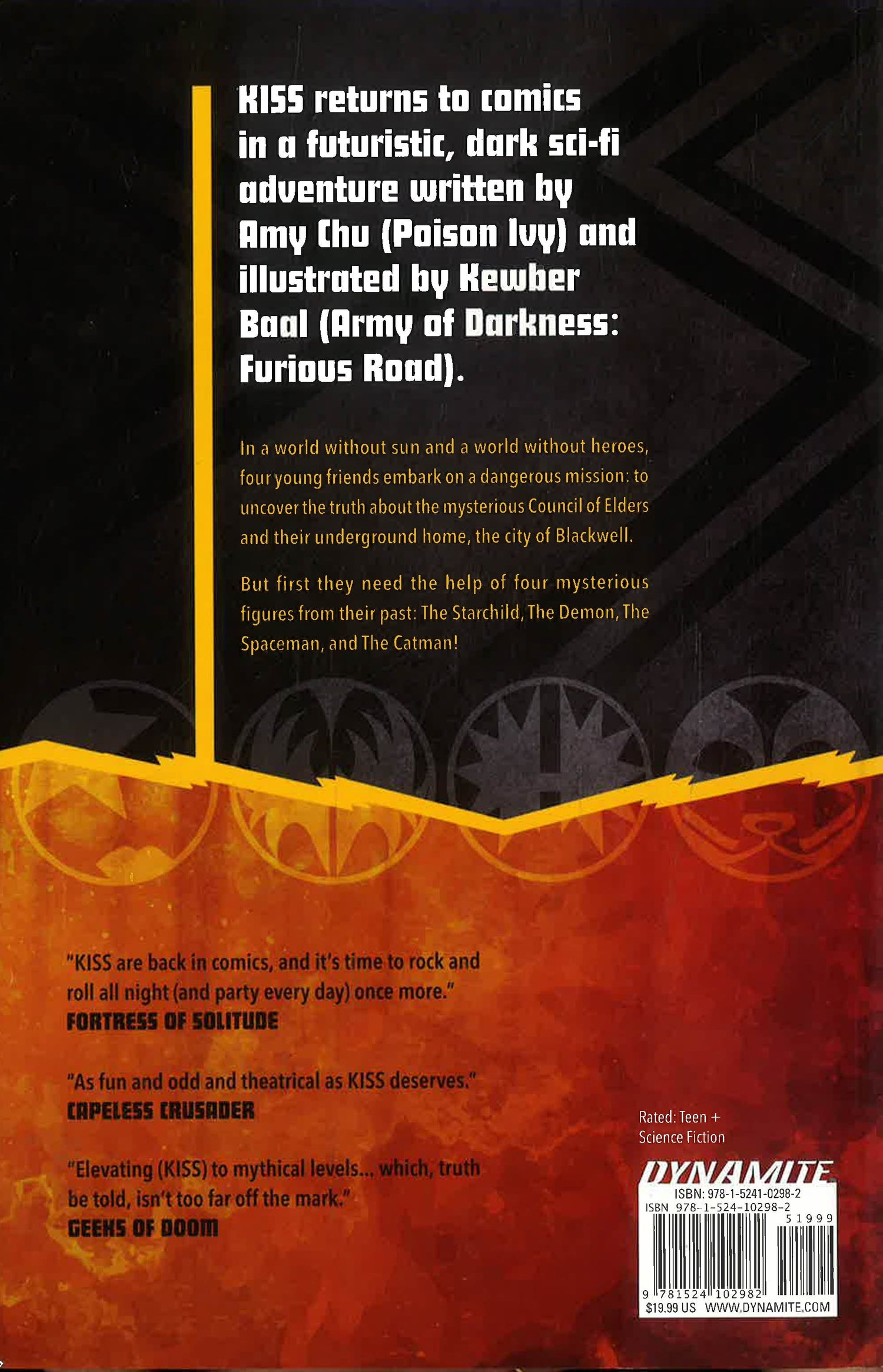 KISS returns to comics in a futuristic, dark sci-fi adventure written by Amy Chu (Poison Ivy) and illustrated by Kewber Baal (Army of Darkness: Furious Road). In a world without sun and a world without heroes, four young friends embark on a dangerous mission - to uncover the truth about the mysterious Council of Elders and their underground home, the city of Blackwell. But first they need some help from the past...