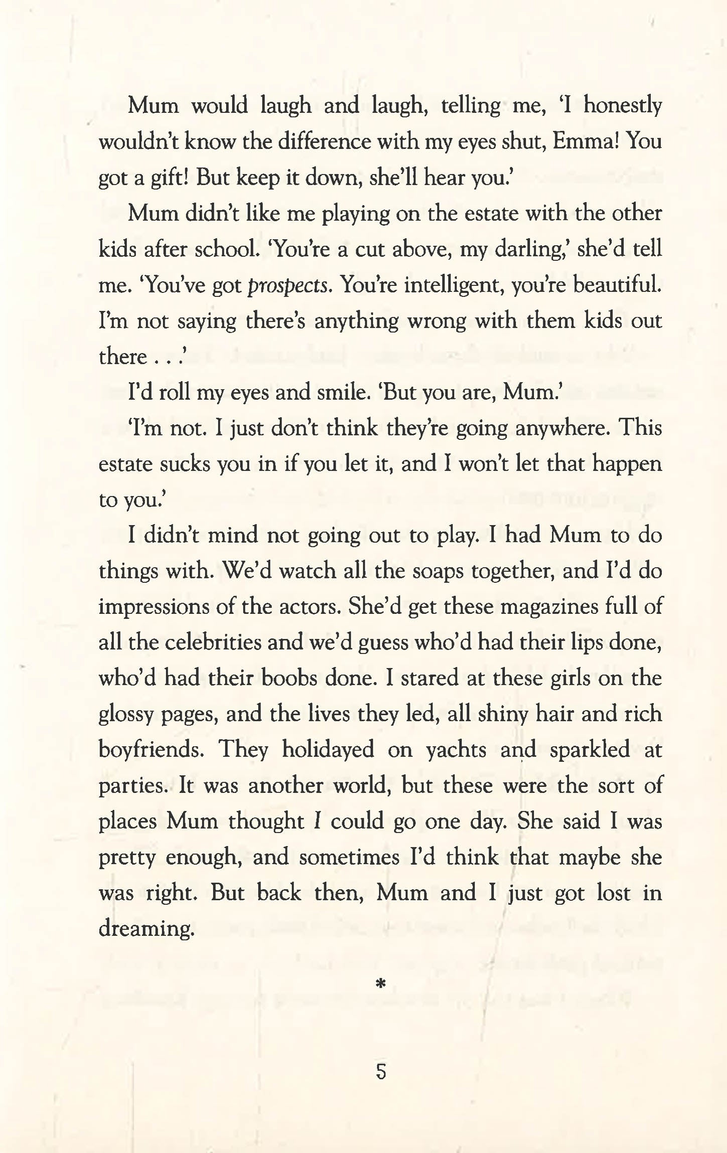 Emma and her mother are down on their luck. They're taking turns sleeping on the sofa in her nan's tiny flat - and desperately trying to come up with an escape plan. Emma is struggling with her family, struggling at school where the girls are bitchy towards her and the boys only seem to want one thing, and struggling with never having enough money for anything, ever. Just as she's contemplating quitting school to get a real job, she meets two men who convince her that she has a shot at modelling. But their motives are far from innocent, and Emma is soon pulled into a dark world. And then she meets Con, who is rich, handsome and so romantic! Has Emma's luck finally changed?