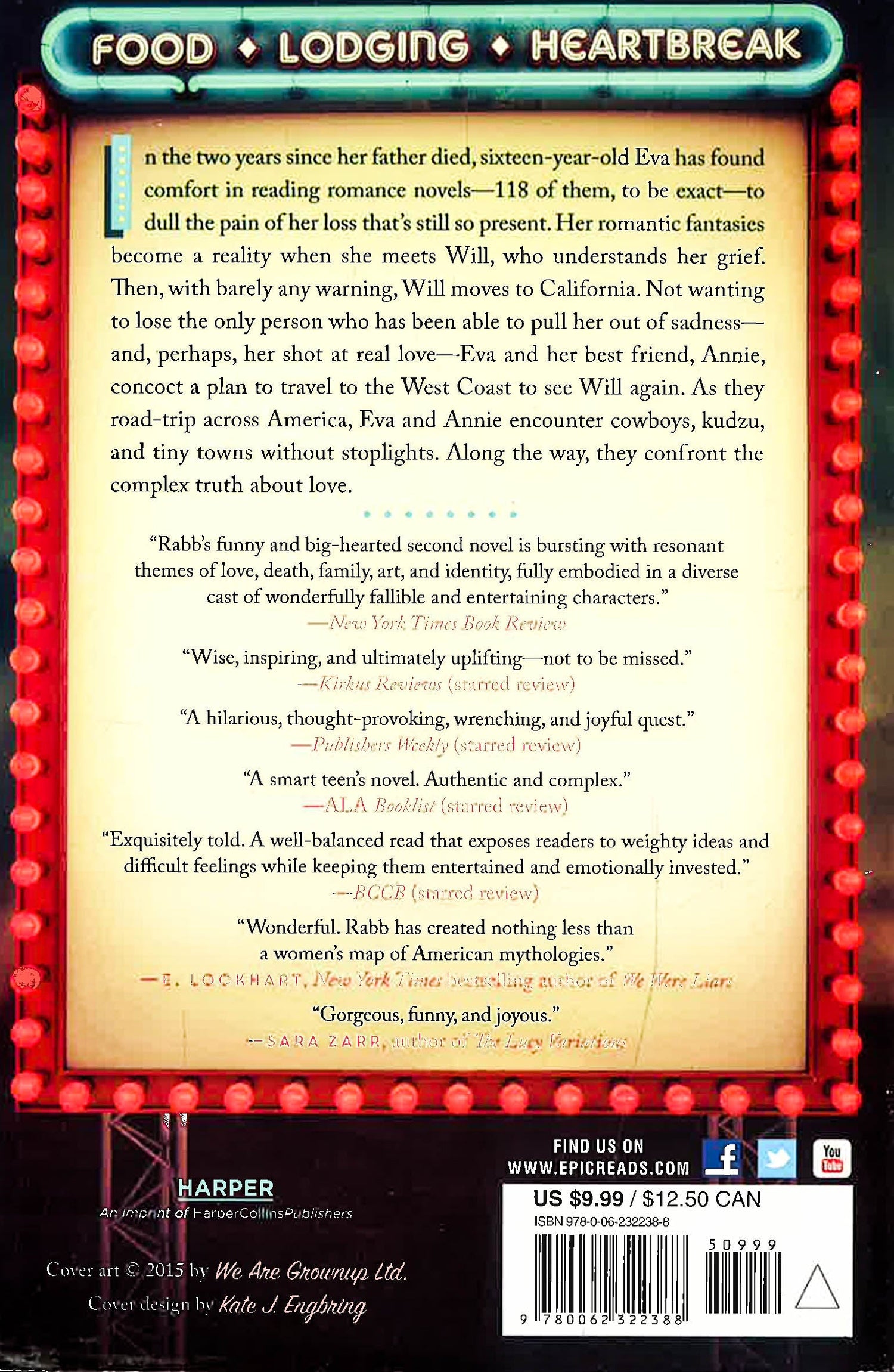 In the two years since her father died, sixteen-year-old Eva has found comfort in reading romance novels - 118 of them, to be exact - to dull the pain of her loss that’s still so present. Her romantic fantasies become a reality when she meets Will, who can relate to Eva’s grief. Unfortunately, after Eva falls head-over-heels for him, he picks up and moves to California with barely any warning. Not wanting to lose the only person who has been able to pull her out of sadness - , perhaps, her first shot at real love - and her best friend, Annie, concoct a plan to travel to the west coast. As they road trip across America, Eva and Annie confront the complex truth about love. In this honest and emotional journey that National Book Award Finalist Sara Zarr calls “gorgeous, funny, and joyous,” readers will experience the highs of infatuation and the lows of heartache as Eva contends with love in all of its forms.