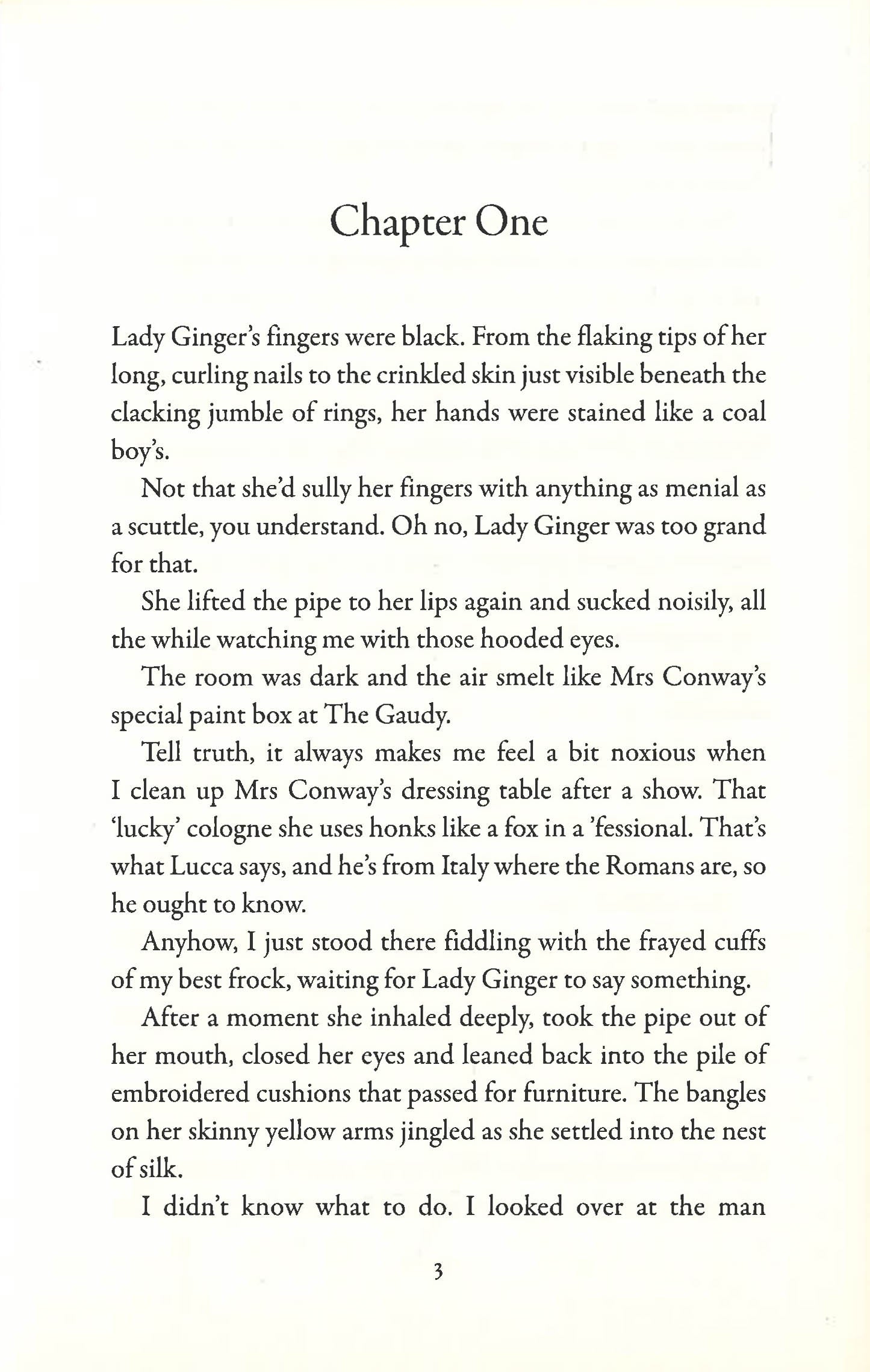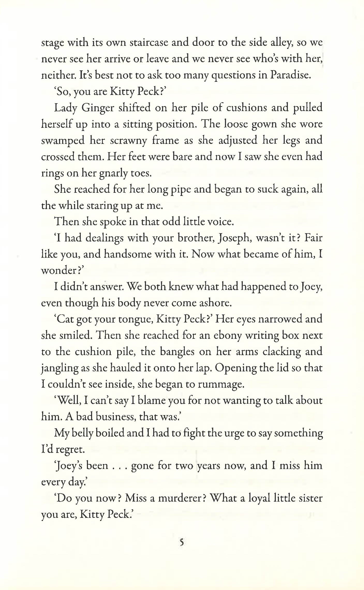Limehouse, 1880: Dancing girls are going missing from 'Paradise' - the criminal manor with ruthless efficiency by the ferocious Lady Ginger. Seventeen-year-old music hall seamstress Kitty Peck finds herself reluctantly drawn into a web of blackmail, depravity and murder when The Lady devises a singular scheme to discover the truth. But as Kitty's scandalous and terrifying act becomes the talk of London, she finds herself facing someone even more deadly and horrifying than The Lady. Bold, impetuous and blessed with more brains than she cares to admit, it soon becomes apparent that it's up to the unlikely team of Kitty and her stagehand friend, Lucca, to unravel the truth and ensure that more girls do not meet with a similar fate. But are Kitty's courage and common sense and Lucca's book learning a match for the monster in the shadows? Their investigations take them from the gin-fuelled halls and doss houses of the East End to the champagne-fuelled galleries of the West End. Take nothing at face value: Kitty is about to step out on a path of discovery that changes everything . . .
