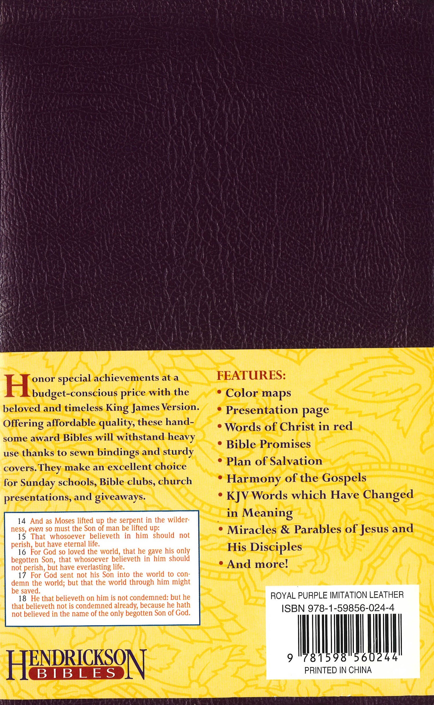 The beloved and timeless King James Version is made available in an affordable quality edition for Sunday schools, Bible clubs, church presentations, and giveaways. This handsome award Bible will withstand heavy use thanks to better quality paper and supple but sturdy cover material. Includes full-color maps. A great way to honor special achievements--at a budget-conscious price!
