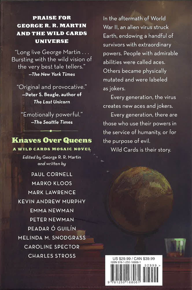 Developed by aliens and field-tested on Earth, the virus known as Xenovirus Takis-A was released in New York in 1946, changing the course of human history forever. Most of those infected die -- and a tiny percentage become deformed beings known as jokers. A lucky few survivors become aces: superhumans gifted with amazing powers. Now the virus has reached Britain. There, Prime Minister Sir Winston Churchill, gifted with extraordinary longevity, together with the Enigma ace Alan Turing, set up a special organization named the Order of the Silver Helix. They will need all of the wild cards they can find if they are to deal with the terrifying mutations spawned by the virus. Edited by #1 New York Times bestselling author George R. R. Martin and Melinda M. Snodgrass, Knaves Over Queens features the writing talents of Paul Cornell, Marko Kloos, Mark Lawrence, Kevin Andrew Murphy, Emma Newman, Peter Newman, Peadar O Guilin, Melinda M. Snodgrass, Caroline Spector, and Charles Stross. Now in development for TV: Rights to develop Wild Cards have been acquired by Universal Cable Productions, the team behind The Magicians and Mr. Robot, with the co-editor of Wild Cards, Melinda Snodgrass, as executive producer. The Wild Cards Universe