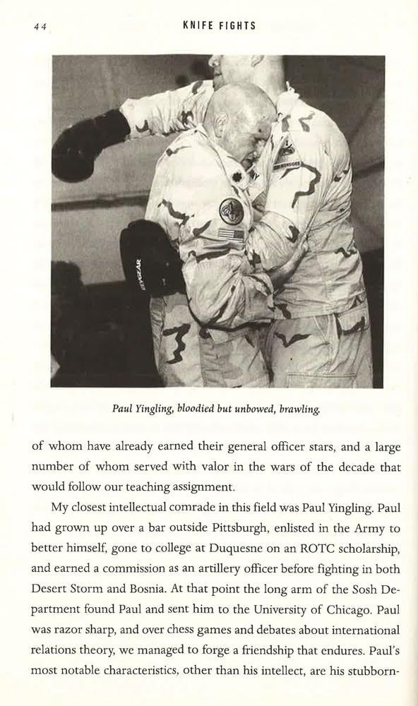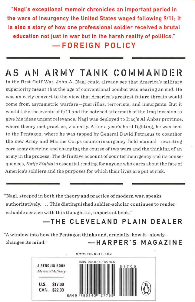 From one of the most important Army officers of his generation, a memoir of the military's revolution in counterinsurgency warfare Delivering a profound education in modern warfare, John Nagl's Knife Fights is essential reading for anyone who cares about the fate of America's soldiers and the purposes for which their lives are put at risk. As an army tank commander in the first Gulf War, Nagl was an early convert to the view that America's greatest future threats would come from asymmetric warfare--guerrillas, terrorists, and insurgents. His Oxford thesis on the lessons of Vietnam--eventually published as a book called Learning to Eat Soup with a Knife--became the bible of the counterinsurgency movement. But it would take 9/11 and the botched aftermath of the Iraq invasion to give his ideas contemporary relevance. After a year's hard fighting in Iraq's Anbar Province, where Nagl served as operations officer of a tank battalion in the 1st Infantry Division, he was asked by General David Petraeus to coauthor the new Army and Marine Corps counterinsurgency field manual--rewriting core doctrine that would change the course of two wars and the thinking of an army. Knife Fights is the definitive account of counterinsurgency and its consequences by the man who was the doctrine's leading architect.