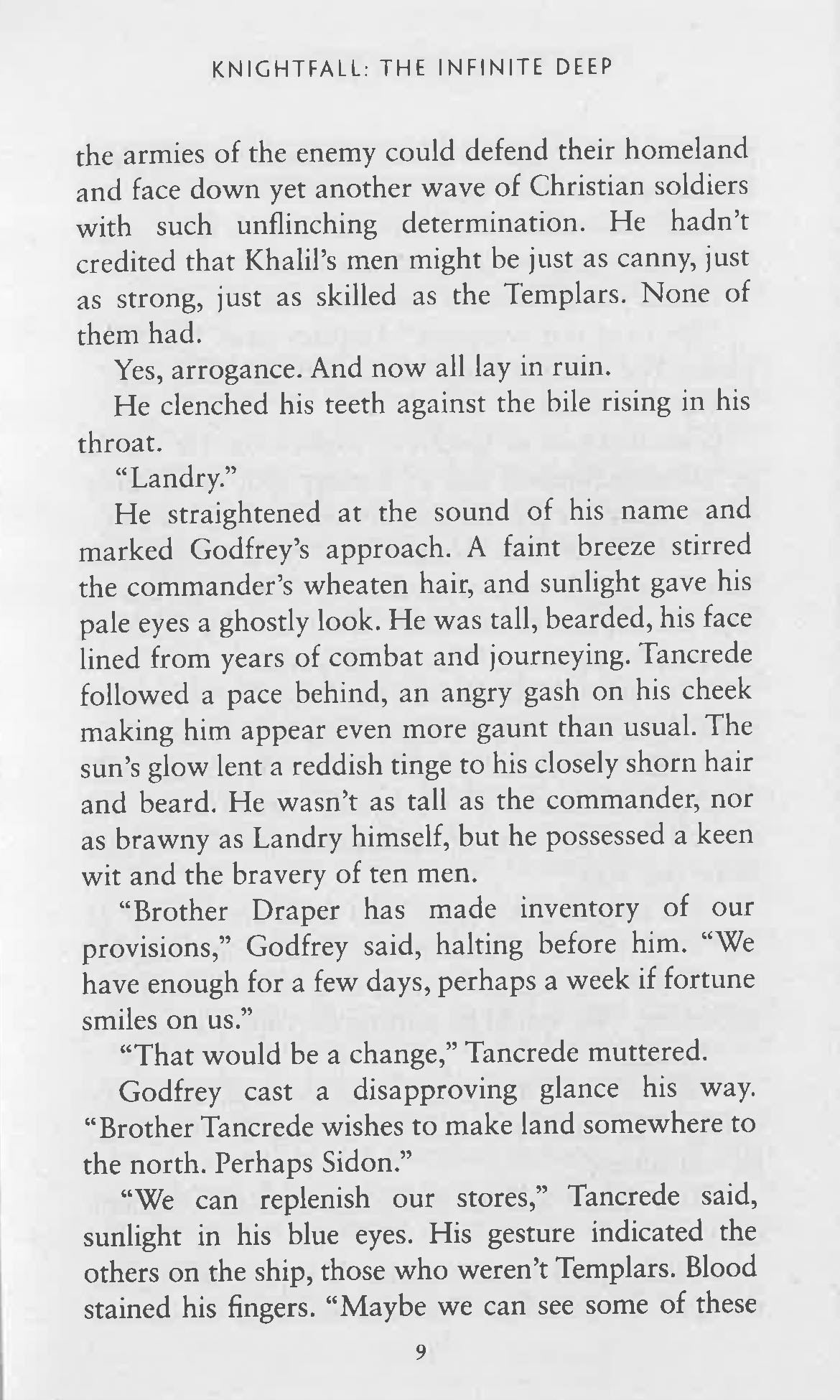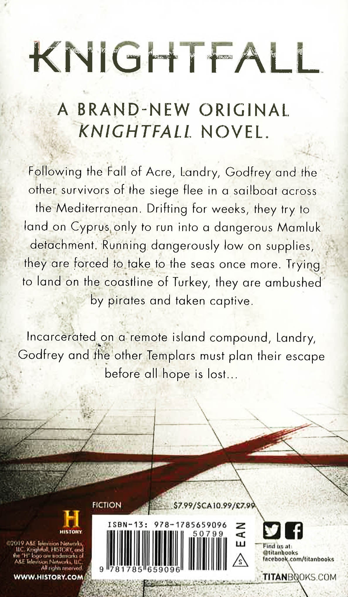 A brand-new original Knightfall novel. Following the Fall of Acre, Landry, Godfrey and the other survivors of the siege flee in a sailboat across the Mediterranean. Drifting for weeks, they try to land on Cyprus only to run into a dangerous Mamluk detachment. Running dangerously low on supplies, they are forced to take to the seas once more. Trying to land on the coastline of Turkey, they are ambushed by pirates and taken captive. Incarcerated on a remote island compound, Landry, Godfrey and the other Templars must plan their escape before all hope is lost...