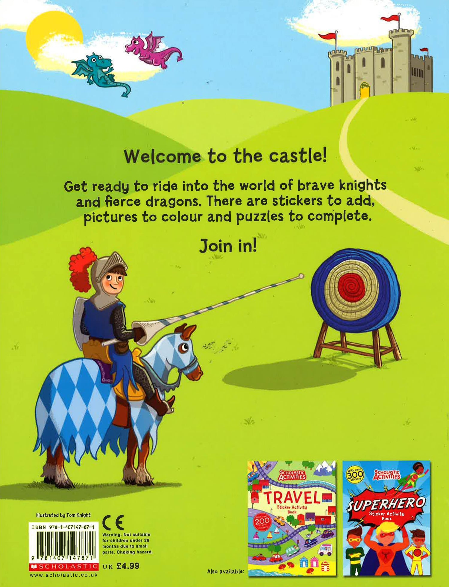 Scholastic Activities - a brand-new range of full-colour sticker-activity books for ages 3+, 5+ and 7+. Collect them all! A fun-filled colour sticker activity book full of stickering, doodling and colouring pages, perfect for children aged 5+. Knights, Dragons and Castles Sticker Activity Book is perfect for all children who love to be heroic. Filled with doodling, drawing and decorating fun. Children can use stickers to decorate the castle for a grand ball, design a shield for a knight, add scary features to fire-breathing dragons and much more. Help knights find their way home through a fiendish maze and spot the hidden dragon eggs. Includes over 200 reusable stickers to use in the book.