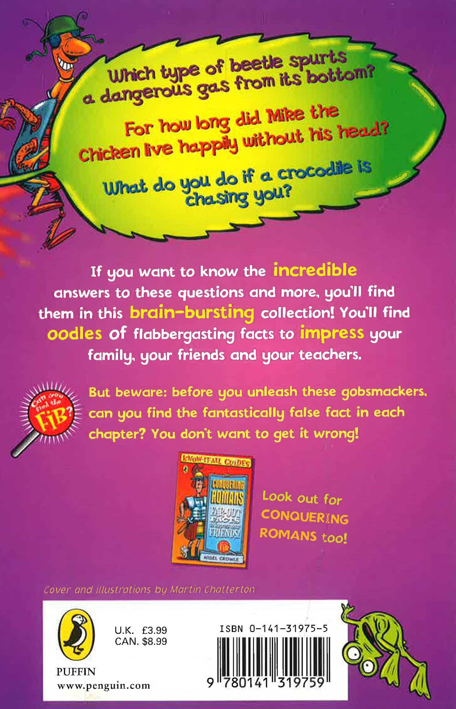 or how long did Mike the Chicken live happily without his head? What do you do if a crocodile is chasing you? Which type of beetle spurts a dangerous gas from its bottom? If you want to know the answers to these incredible questions and more, you will find them in this hilarious new trivia series which guarantees to leave out all the boring bits! You'll find oodles of flabbergasting facts to impress your family, your friends and your teachers. But beware! Each chapter has a fantastically false fib and you have to find it before you wow everyone...