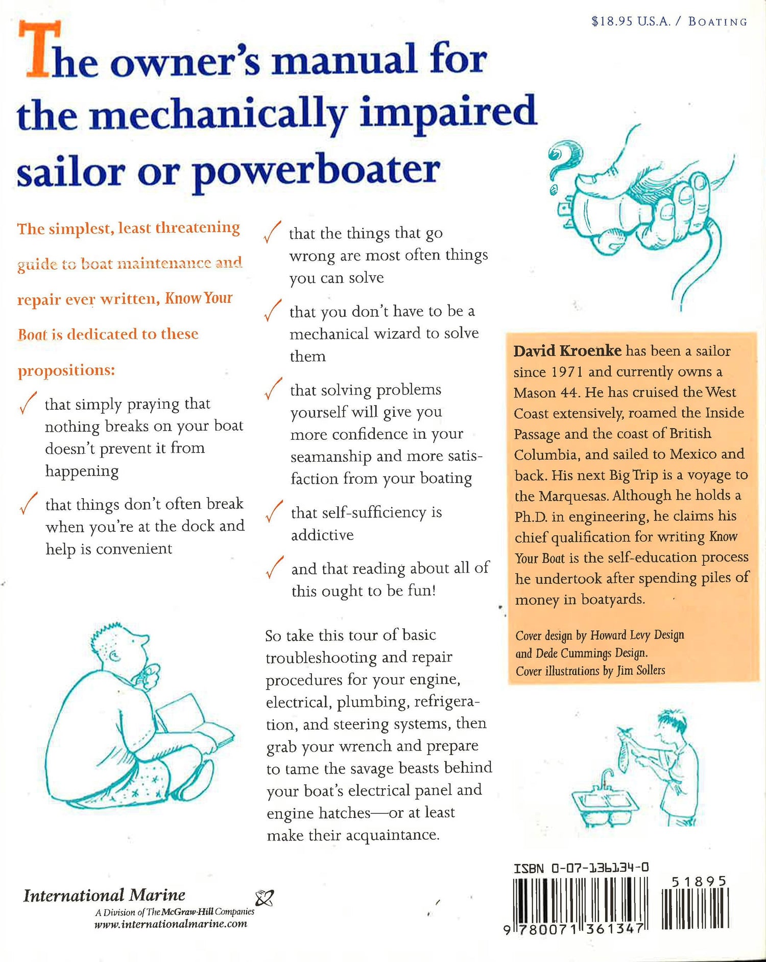 Know Your Boat is here to rescue the millions of boaters who have always been afraid to peer into their boat's innards for fear of what they'll find. Here at last is the humorous, user-friendly guide that will give a timid skipper the courage to grab a wrench and tame the savage beast in the bilge (or at least make its acquaintance). Assuming no mechanical aptitude, David Kroenke provides readers with an easy-to-read introduction to the use and maintenance of the many systems found on today's typical power or sail boat, including: engine, electricity, electronics, plumbing, refrigeration, windlasses, pumps, and steering system.