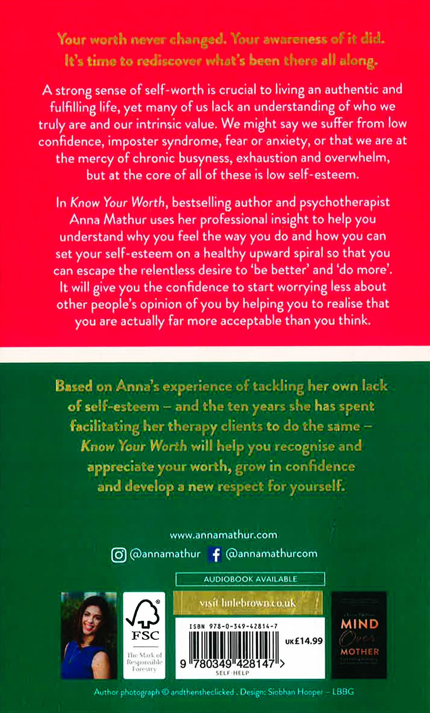 Using Anna's own experience of embarking on this journey herself, and spending ten years facilitating her therapy clients to do the same, Know Your Worth will help you to understand why you feel the way you do, what perpetuates it and what the cost of low self-esteem has been for you. It will provide the coping mechanisms, habits and tips that will redirect your self-esteem on a healthy and fulfilling upward spiral and help you to escape the relentless desire to 'be better' and 'do more' with the realisation that perhaps you were actually far more acceptable than you first thought.