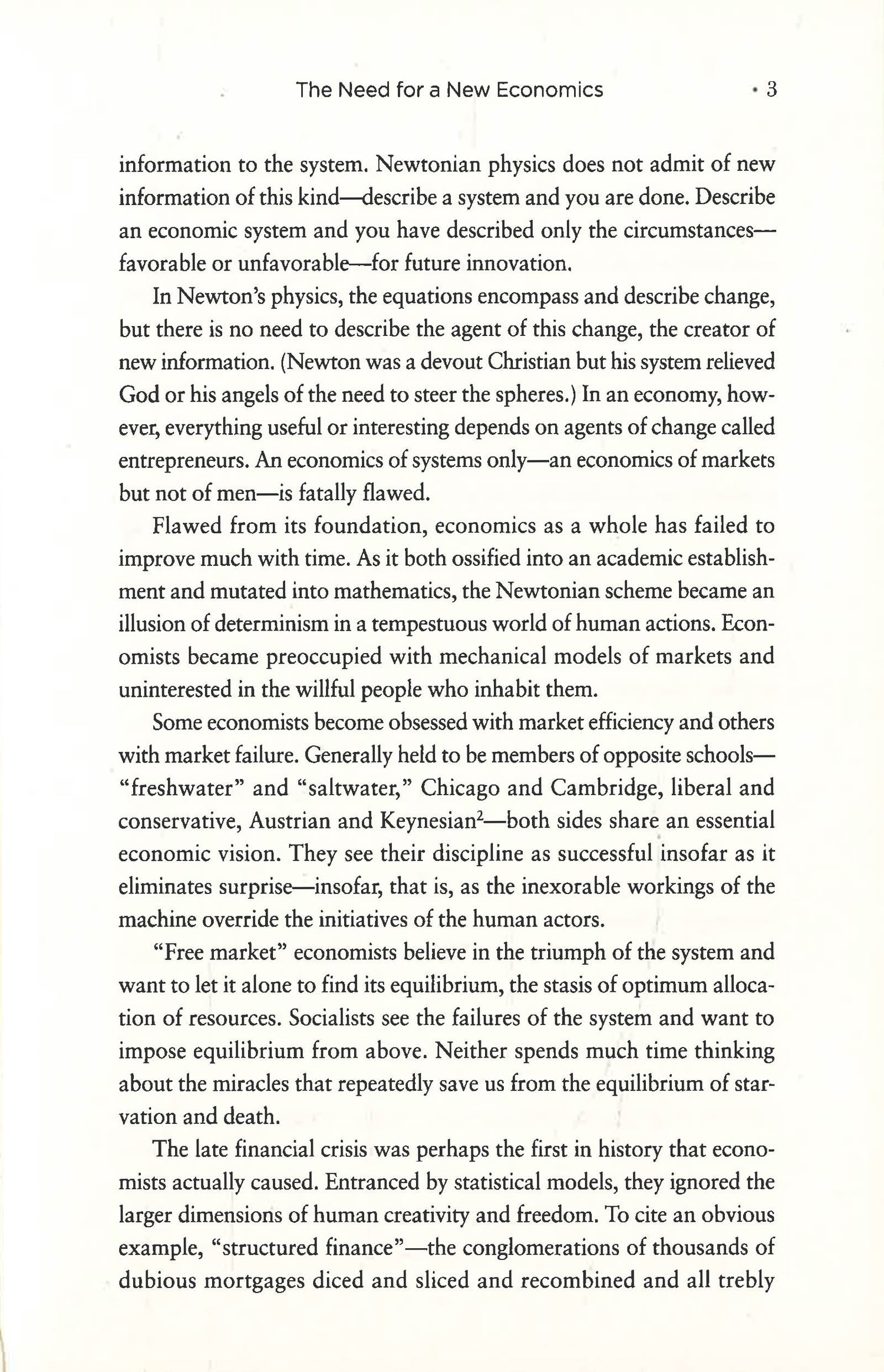 Gilder breaks away from the supply-side model of economics to present a new economic paradigm: the epic conflict between the knowledge of entrepreneurs on one side, and the blunt power of government on the other. The knowledge of entrepreneurs, and their freedom to share and use that knowledge, are the sparks that light up the economy and set its gears in motion. The power of government to regulate, stifle, manipulate, subsidize or suppress knowledge and ideas is the inertia that slows those gears down, or keeps them from turning at all.