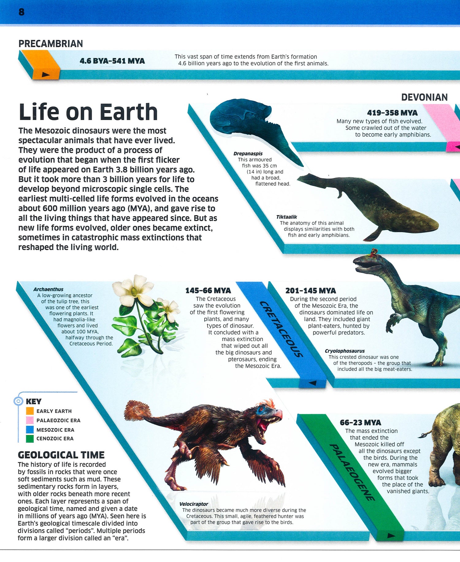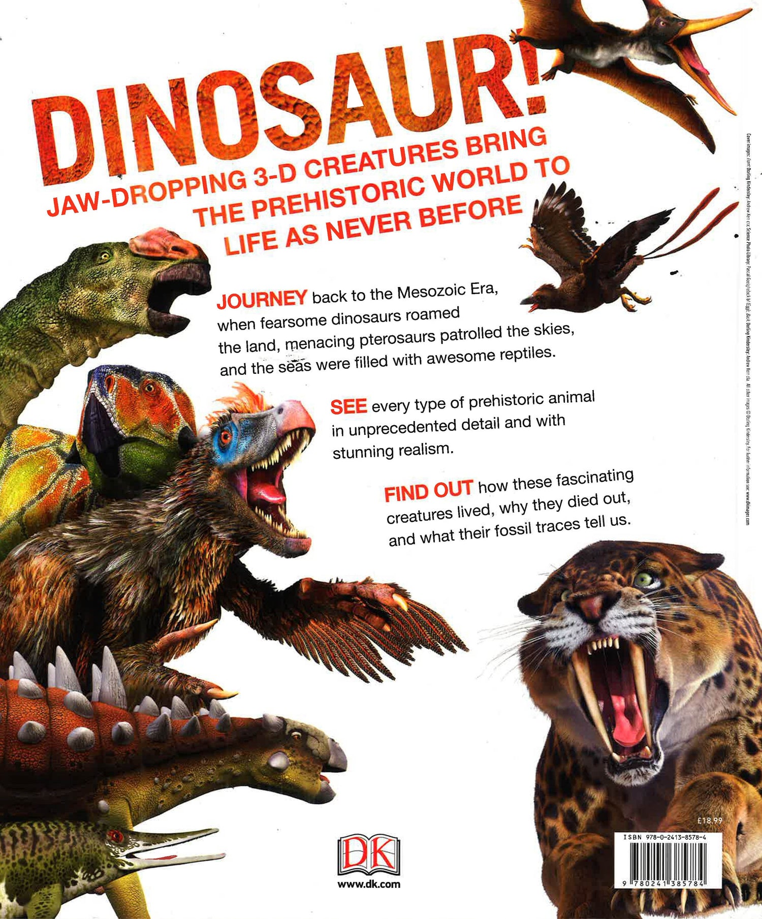 If you are mad about dinosaurs this is the perfect encyclopediafor you. This fully revised edition is loaded with fascinatingfacts and incredibly realistic 3-D illustrations that capturedinosaurs stomping roaring and snapping across the prehistoricworld. Did you know that Velociraptor had three large killerclaws on each foot to hunt down prey Or that the long-neckedDiplodocus was as long as three school buses Would you believethat Carcharodon megalodon was an ocean monster with a fearsomebite at least six times stronger than a great white sharkRevealing more than 60 prehistoric creatures from the age of thedinosaurs to the Ice Age.