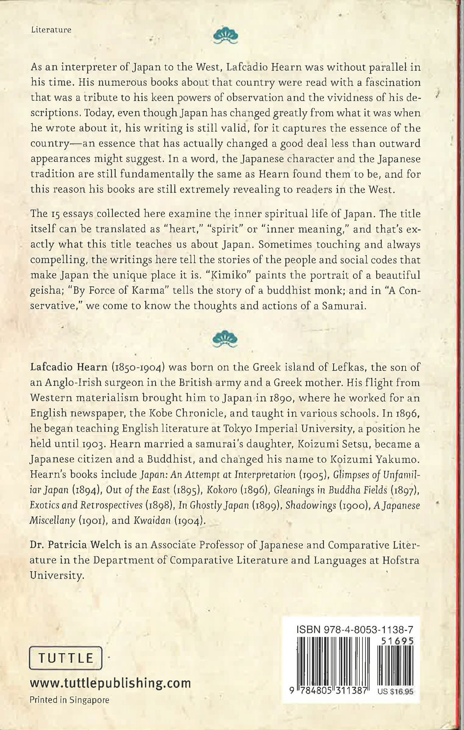 The 15 classic essays collected in Kokoro examine the inner spiritual life of Japan. The title itself can be translated as "heart," "spirit" or "inner meaning," and that's exactly what this collection teaches us about Japan. Sometimes touching and always compelling, the writings here tell the stories of the people and social codes that make Japan the unique place it is. "Kimiko" paints the portrait of a beautiful geisha; "By Force of Karma" tells the story of a Buddhist monk; and in "A Conservative," we come to know the thoughts and actions of a Samurai. As an early interpreter of Japan to the West, Lafcadio Hearn was without parallel in his time. His numerous books about that country were read with a fascination that was a tribute to his keen powers of observation and the vividness of his descriptions. Today, even though Japan has changed greatly from what it was when he wrote about it, his writing is still valid, for it captures the essence of the country--an essence that has actually changed a good deal less than outward appearances might suggest. In a word, the Japanese character and the Japanese tradition are still fundamentally the same as Hearn found them to be, and for this reason his books are still extremely revealing to readers in the West.