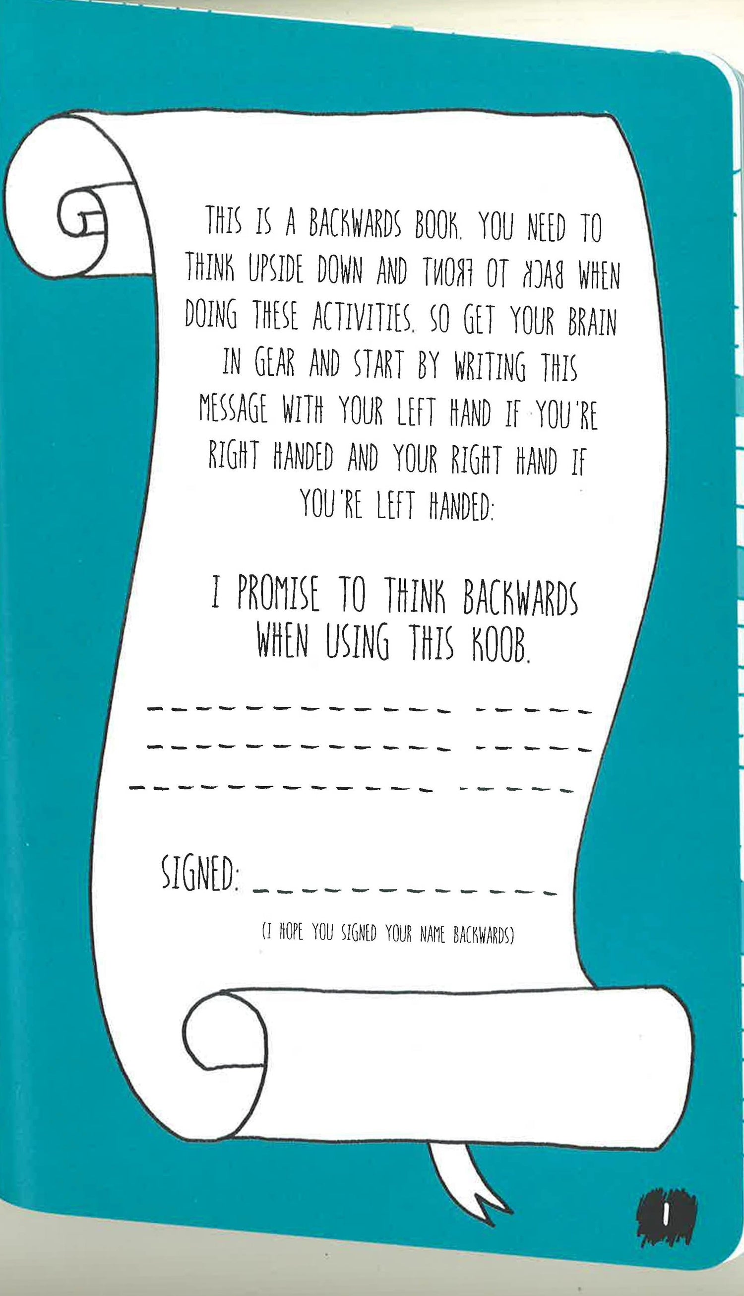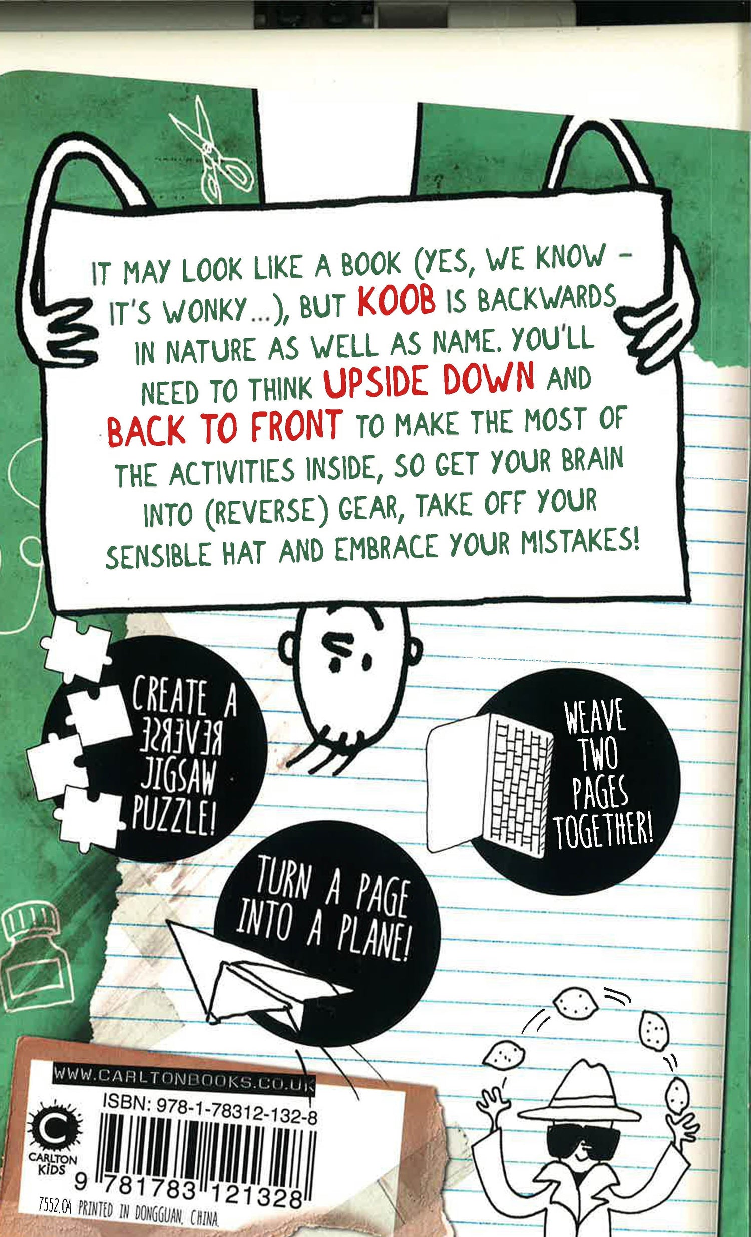 Young readers will be thrilled by this unusual title filled with hilarious creative activities. It may look like a book, but KOOB is backwards in nature as well as in name, as it encourages readers to pull the pages apart and make a mess. Turn the book upside down and start at the back then doodle, cut, stick, fold, scribble and have fun! Take off your sensible hat and embrace your mistakes. See the world differently!
