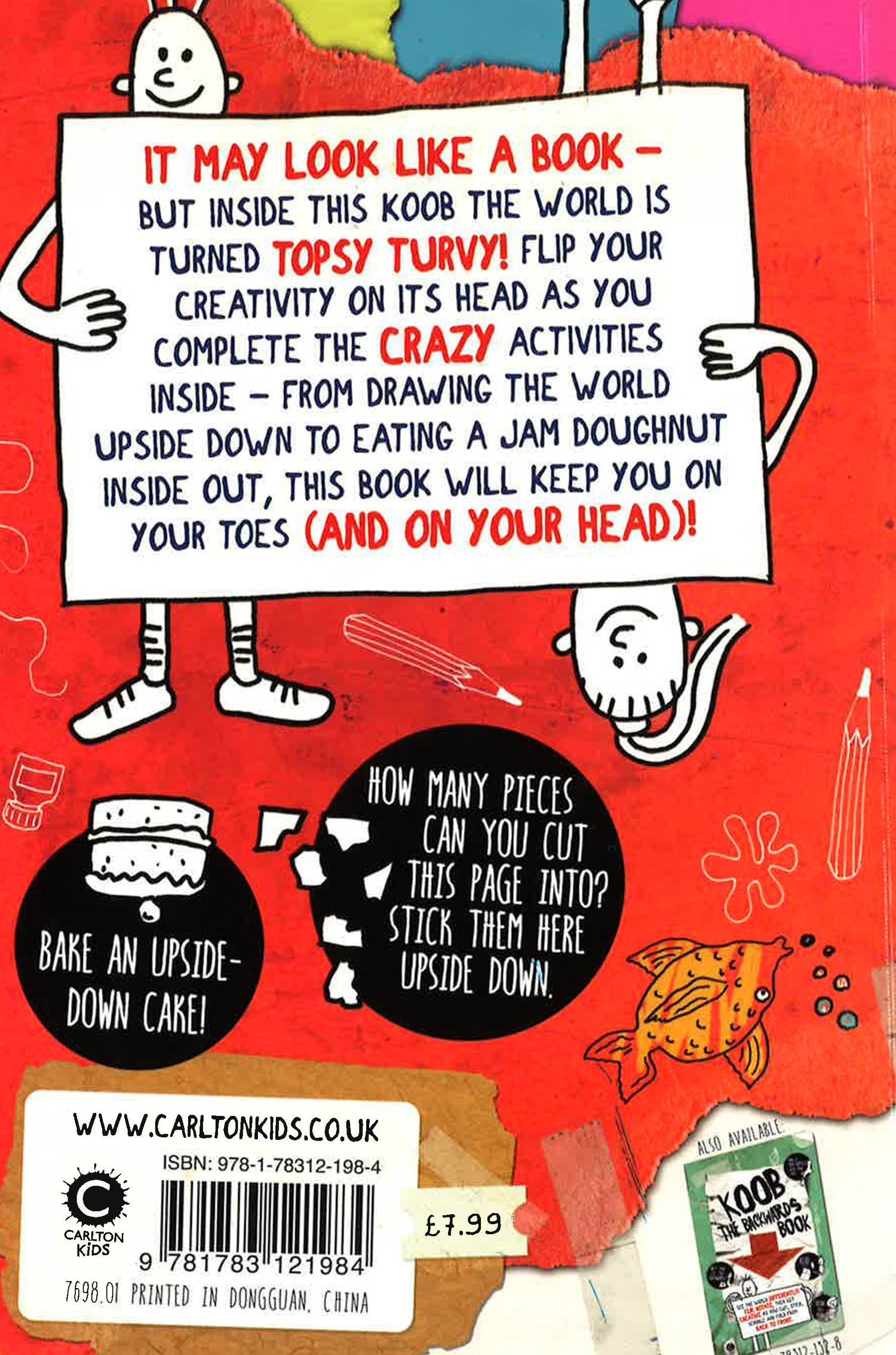 The follow-up to Carlton's successful Koob: The Backwards Book, this title has even more crazy activities that make you see the world a little differently! In Koob 2: The Upside Down Book take a new perspective as you do hang your head between your legs, do a headstand or ride a rollercoaster, all while completing the hilarious and creative activities in the book. Write, draw, stick, rip, and scribble your way through 144 pages of upside down fun!