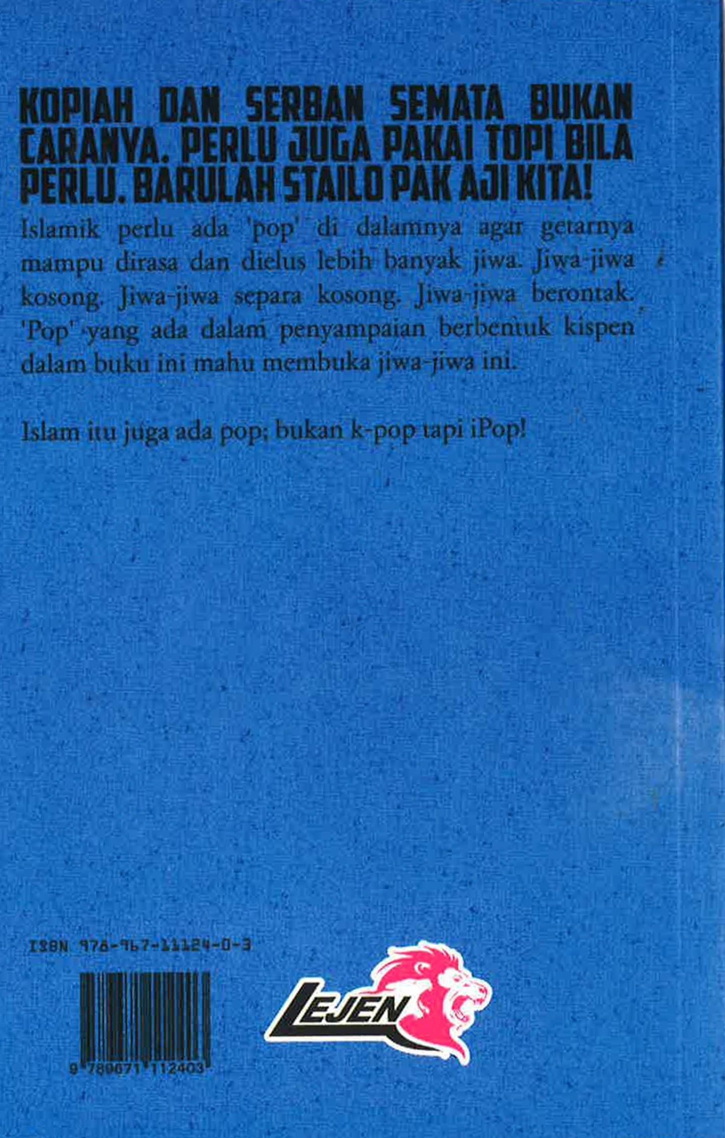 Kopiah dan serban semata bukan caranya. Perlu juga pakai topi bila perlu. Barulah stailo pak aji kita! Islamik perlu ada ‘pop' di dalamnya agar getarnya mampu dirasa dan dielus lebih banyak jiwa. Jiwa-jiwa kosong. Jiwa-jiwa separa kosong. Jiwa-jiwa berontak. ‘Pop' yang ada dalam penyampaian berbentuk kispen dalam buku ini mahu membuka jiwa-jiwa ini.