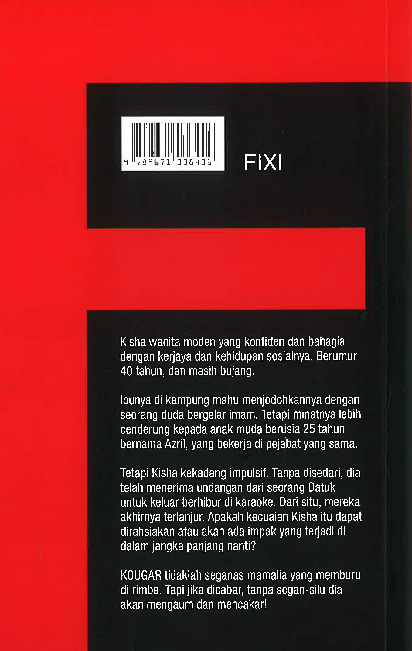 Kisha wanita moden yang konfiden dan bahagia dengan kerjaya dan kehidupan sosialnya. Berumur 40 tahun, dan masih bujang.Ibunya di kampung mahu menjodohkannya dengan seorang duda bergelar imam. Tetapi minatnya lebih cenderung kepada anak muda berusia 25 tahun bernama Azril, yang bekerja di pejabat yang sama.Tetapi Kisha kekadang impulsif. Tanpa disedari, dia telah menerima undangan dari Datuk Emir untuk keluar berhibur di karaoke. Dari situ, mereka akhirnya terlanjur. Apakah kecuaian Kisha itu dapat dirahsiakan atau akan ada impak yang terjadi di dalam jangka panjang nanti?KOUGAR tidaklah seganas mamalia yang memburu di rimba. Tapi jika dicabar, tanpa segan-silu dia akan mengaum dan mencakar!