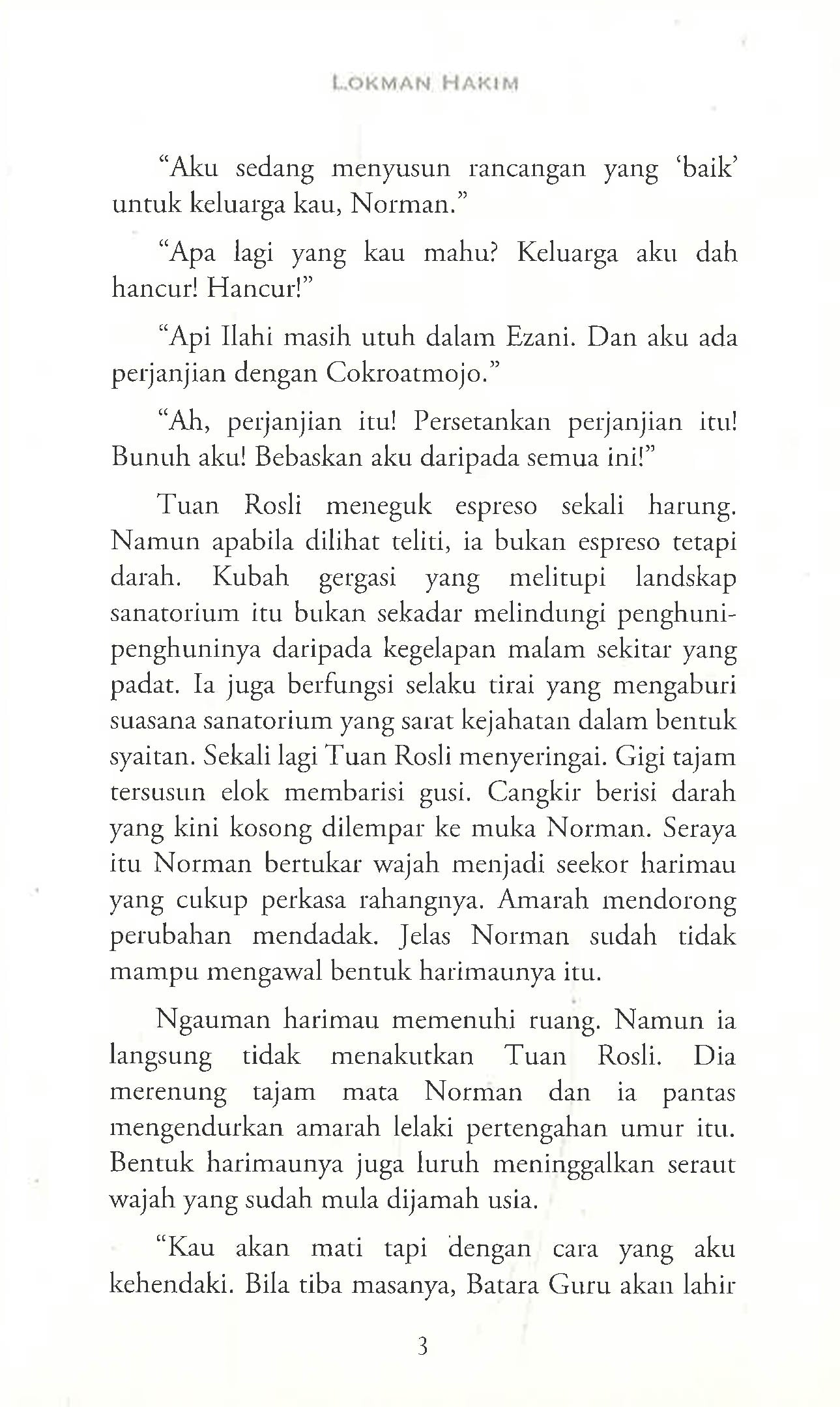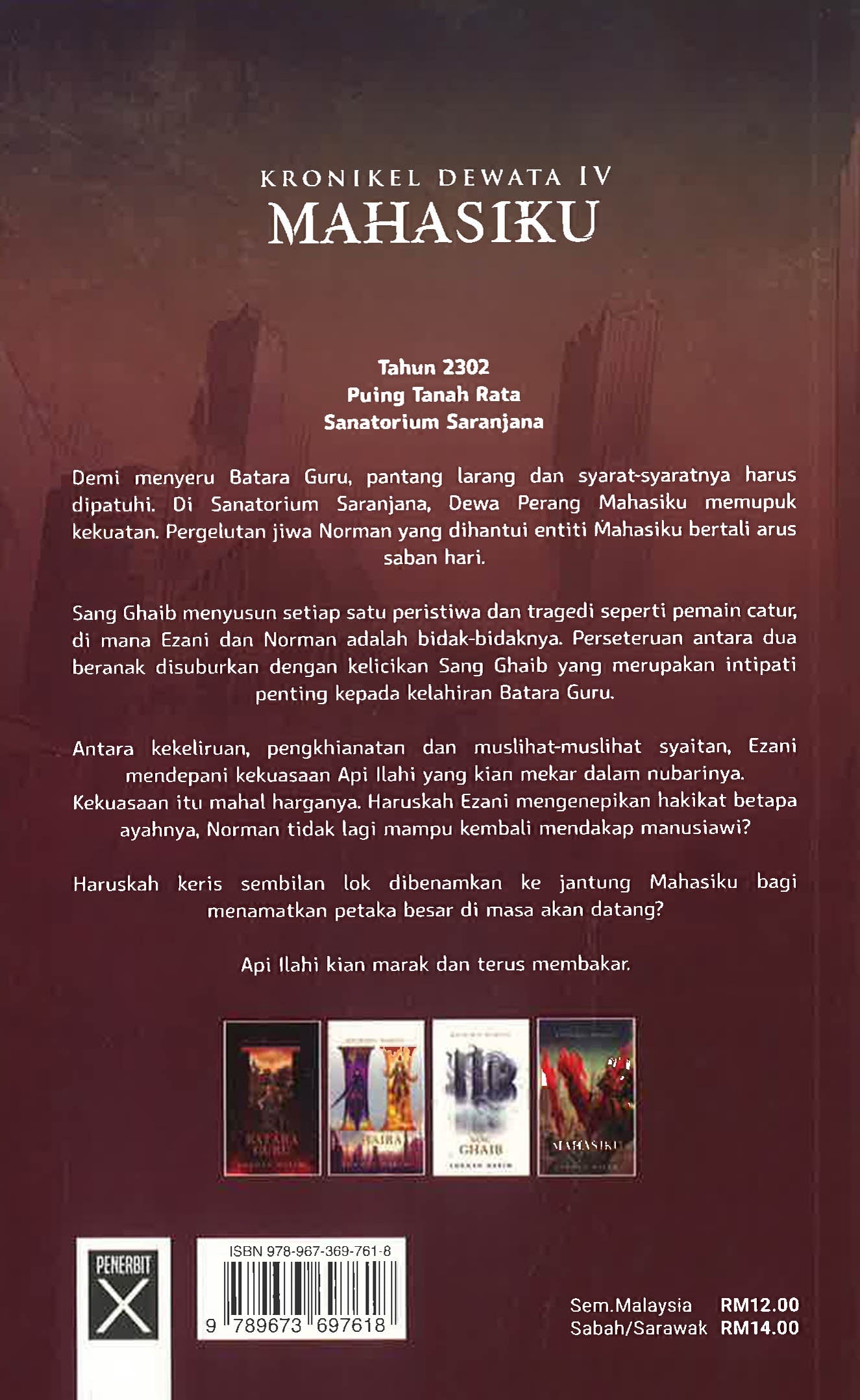 Tahun 2302 Puing Tanah Rata Sanatorium Saranjana Demi menyeru Batara Guru, pantang larang dan syarat-syaratnya harus dipatuhi. Di Sanatorium Saranjana, Dewa Perang Mahasiku memupuk kekuatan. Pergelutan jiwa Norman yang dihantui entiti Mahasiku bertali arus saban hari. Sang Ghaib menyusun setiap satu peristiwa dan tragedi seperti pemain catur, di mana Ezani dan Norman adalah bidak-bidaknya. Perseteruan antara dua beranak disuburkan dengan kelicikan Sang Ghaib yang merupakan intipati penting kepada kelahiran Batara Guru. Antara kekeliruan, pengkhianatan dan muslihat-muslihat syaitan, Ezani mendepani kekuasaan Api Ilahi yang kian mekar dalam nubarinya. Kekuasaan itu mahal harganya. Haruskah Ezani mengenepikan hakikat betapa ayahnya, Norman tidak lagi mampu kembali mendakap manusiawi? Haruskah keris sembilan lok dibenamkan ke jantung Mahasiku bagi menamatkan petaka besar di masa akan datang? Api Ilahi kian marak dan terus membakar.