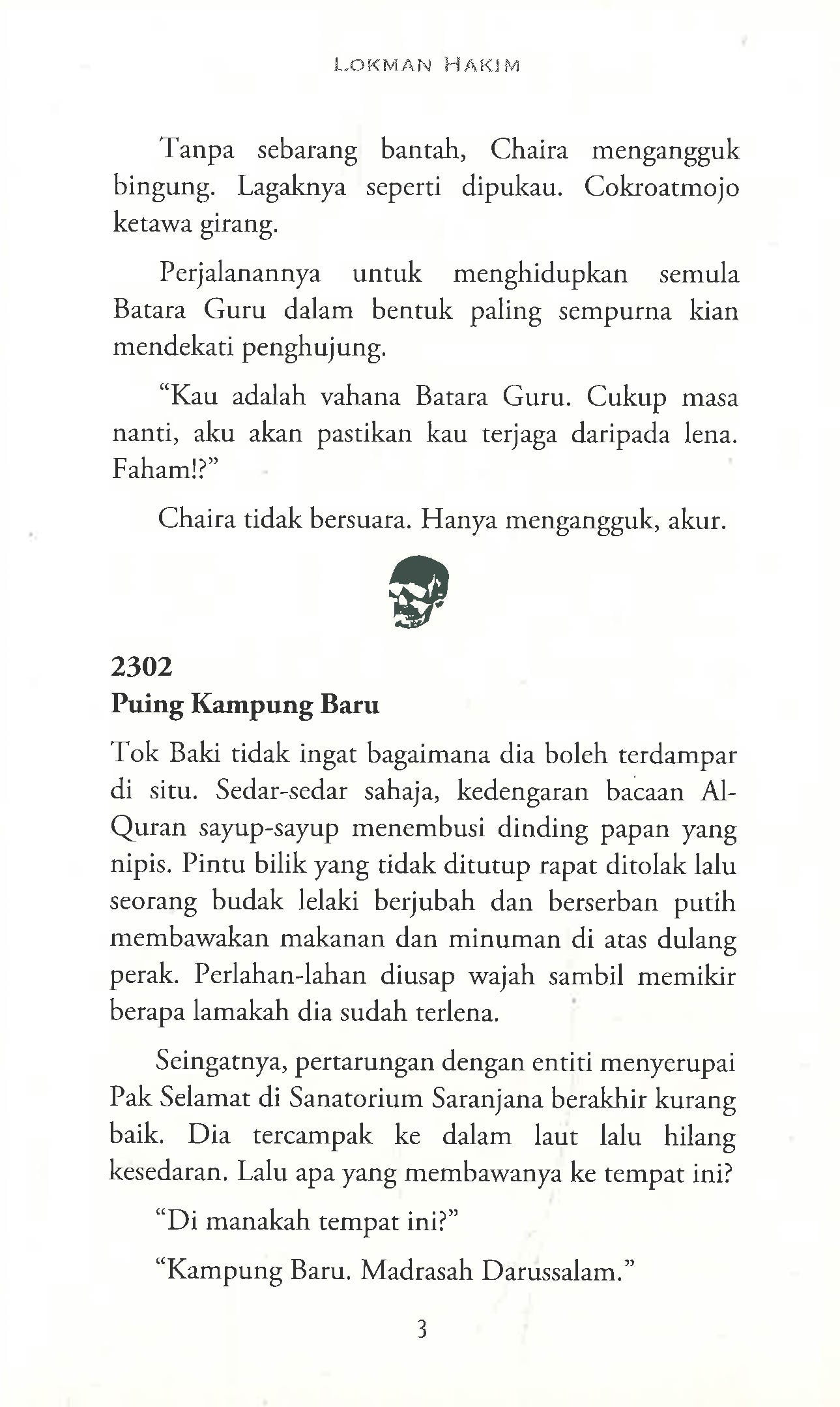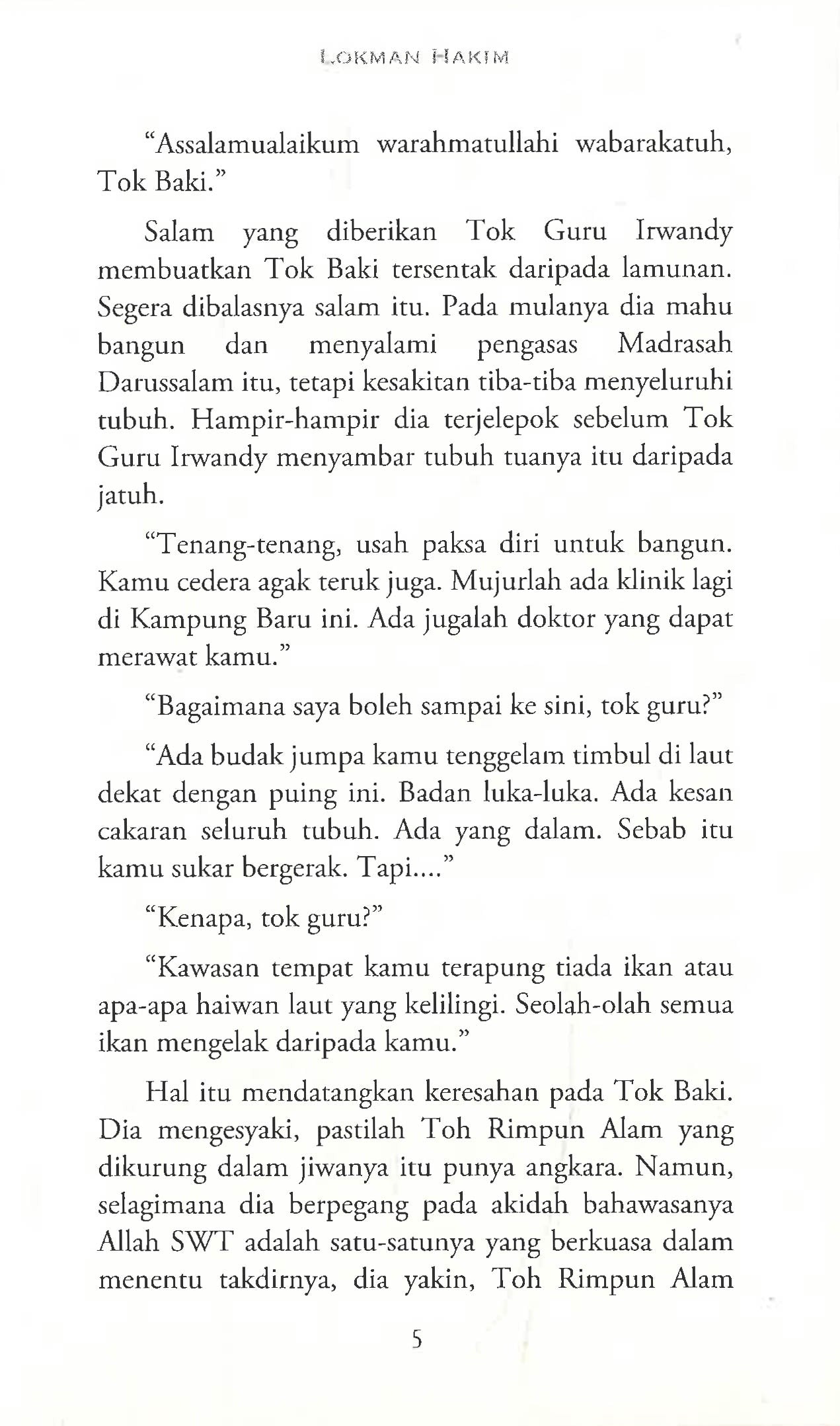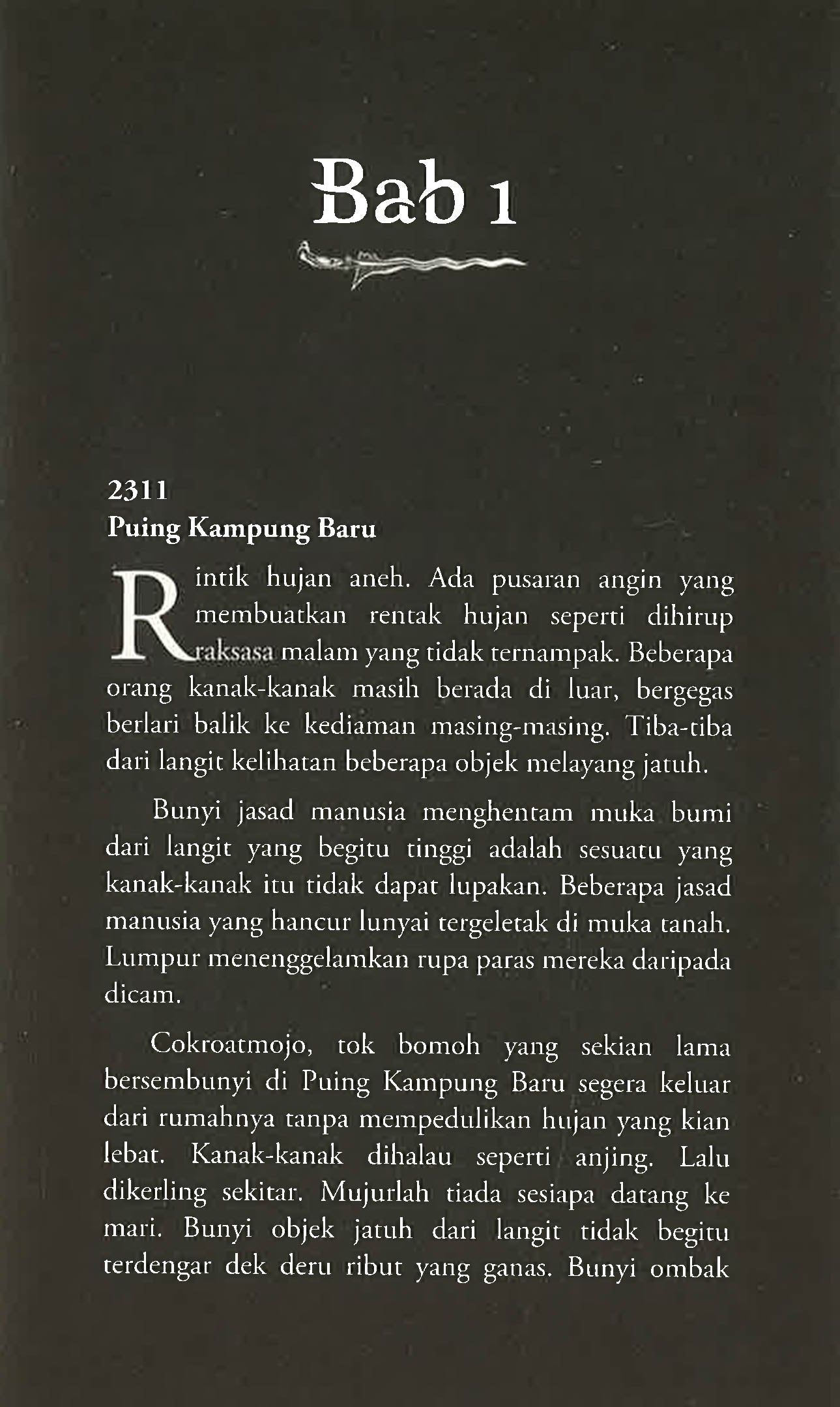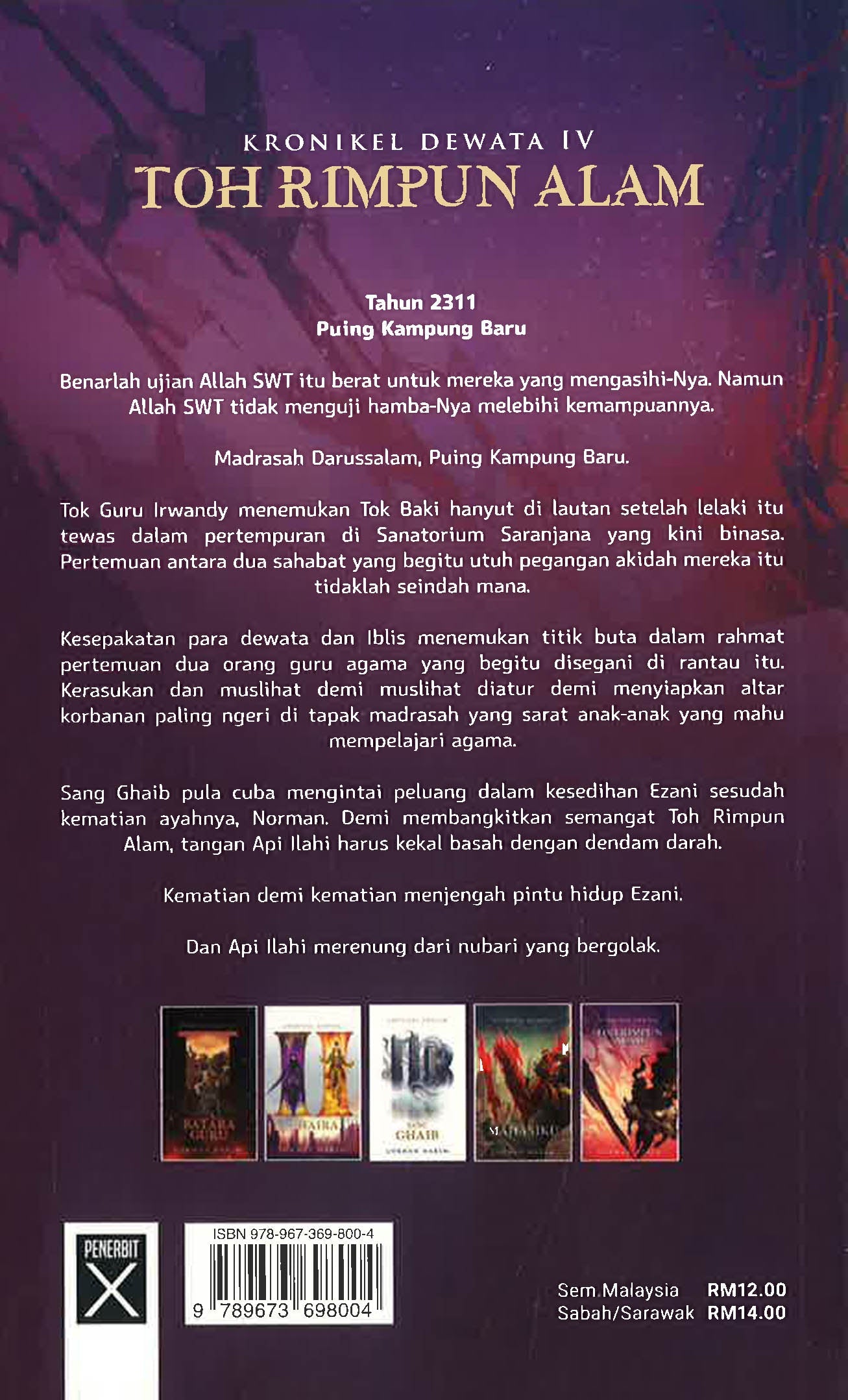 Tahun 2311 Puing Kampung Baru Benarlah ujian Allah SWT itu berat untuk mereka yang mengasihi-Nya. Namun Allah SWT tidak menguji hamba-Nya melebihi kemampuannya. Madrasah Darussalam, Puing Kampung Baru. Tok Guru Irwandy menemukan Tok Baki hanyut di lautan setelah lelaki itu tewas dalam pertempuran di Sanatorium Saranjana yang kini binasa. Pertemuan antara dua sahabat yang begitu utuh pegangan akidah mereka itu tidaklah seindah mana. Kesepakatan para dewata dan Iblis menemukan titik buta dalam rahmat pertemuan dua orang guru agama yang begitu disegani di rantau itu. Kerasukan dan muslihat demi muslihat diatur demi menyiapkan altar korbanan paling ngeri di tapak madrasah yang sarat anak-anak yang mahu mempelajari agama. Sang Ghaib pula cuba mengintai peluang dalam kesedihan Ezani sesudah kematian ayahnya, Norman. Demi membangkitkan semangat Toh Rimpun Alam, tangan Api Ilahi harus kekal basah dengan dendam darah. Kematian demi kematian menjengah pintu hidup Ezani. Dan Api Ilahi merenung dari nubari yang bergolak.