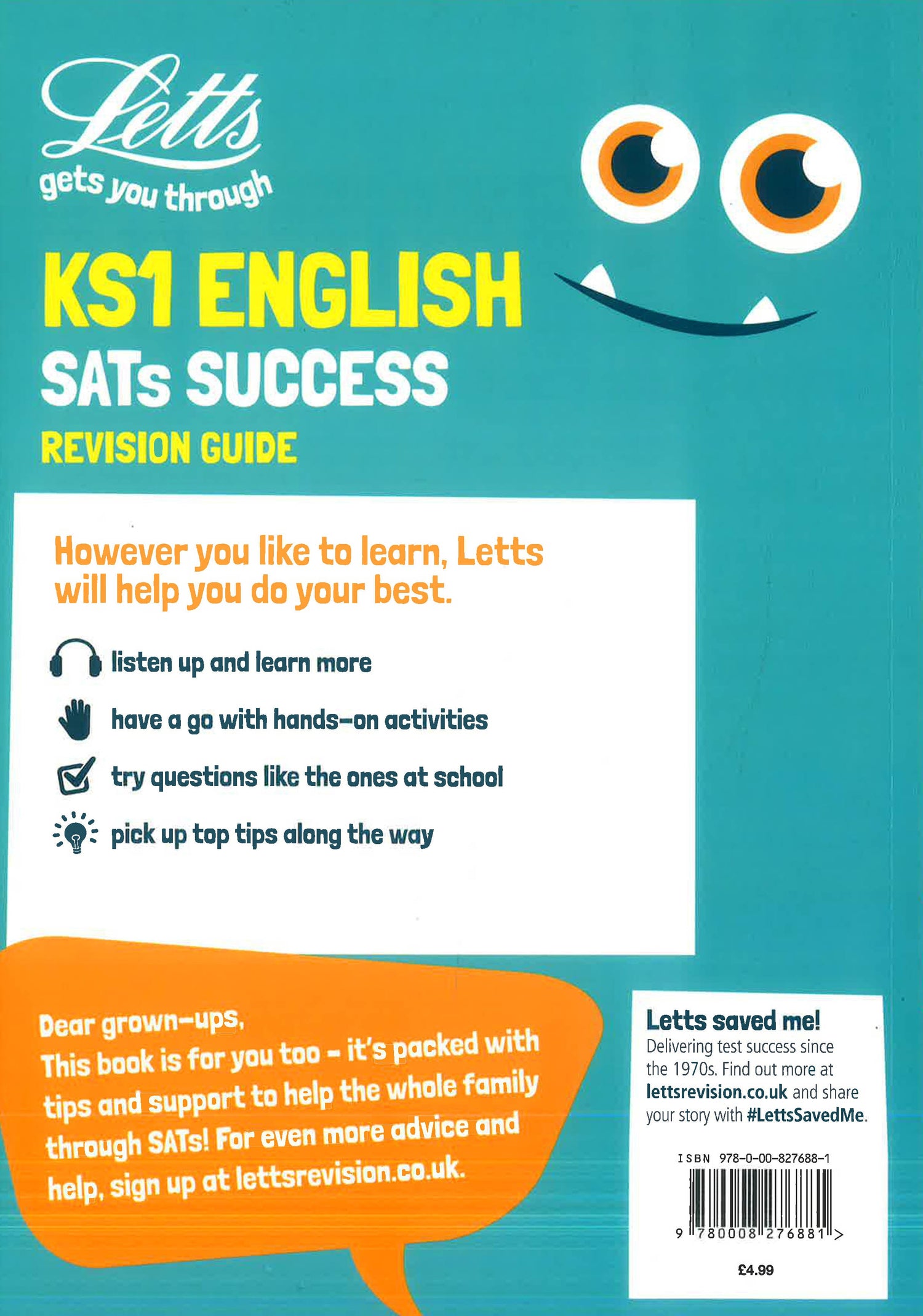 This unique Letts KS1 English SATs Revision Guide uses three different approaches to help children engage with every topic and revise for success at Key Stage 1. Build understanding with simple explanations for every KS1 English topic, as well as quick tests and tons of practice questions. Listen up and learn more with free audio and have a go with hands-on activities. Try KS1 English questions like the ones at school and pick up top tips along the way. This guide has been made ready for the 2020 tests, so you can be too! Our KS1 English SATs Practice Workbook (9780008276904) is also available for more SATs success.