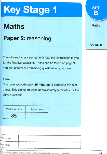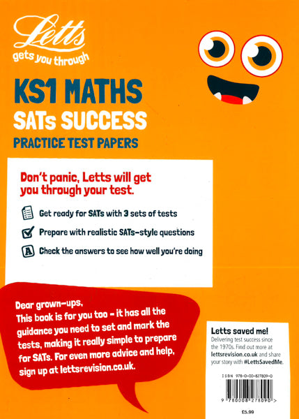 Level: KS1Subject: Maths Don't panic, Letts will get you through your test.Level: KS1Subject: Maths Don't panic, Letts will get you through your test. Need more practice? Letts will help you do your best. * Get ready for SATs with 4 sets of tests* Prepare with realistic SATs-style questions* Check the answers to see how well you're doing These practice papers have been made ready for the tests, so you can be too! Each set includes Paper 1 (arithmetic) and Paper 2 (reasoning). They have everything you need to take and mark the tests, making it really simple to prepare for your SATs.